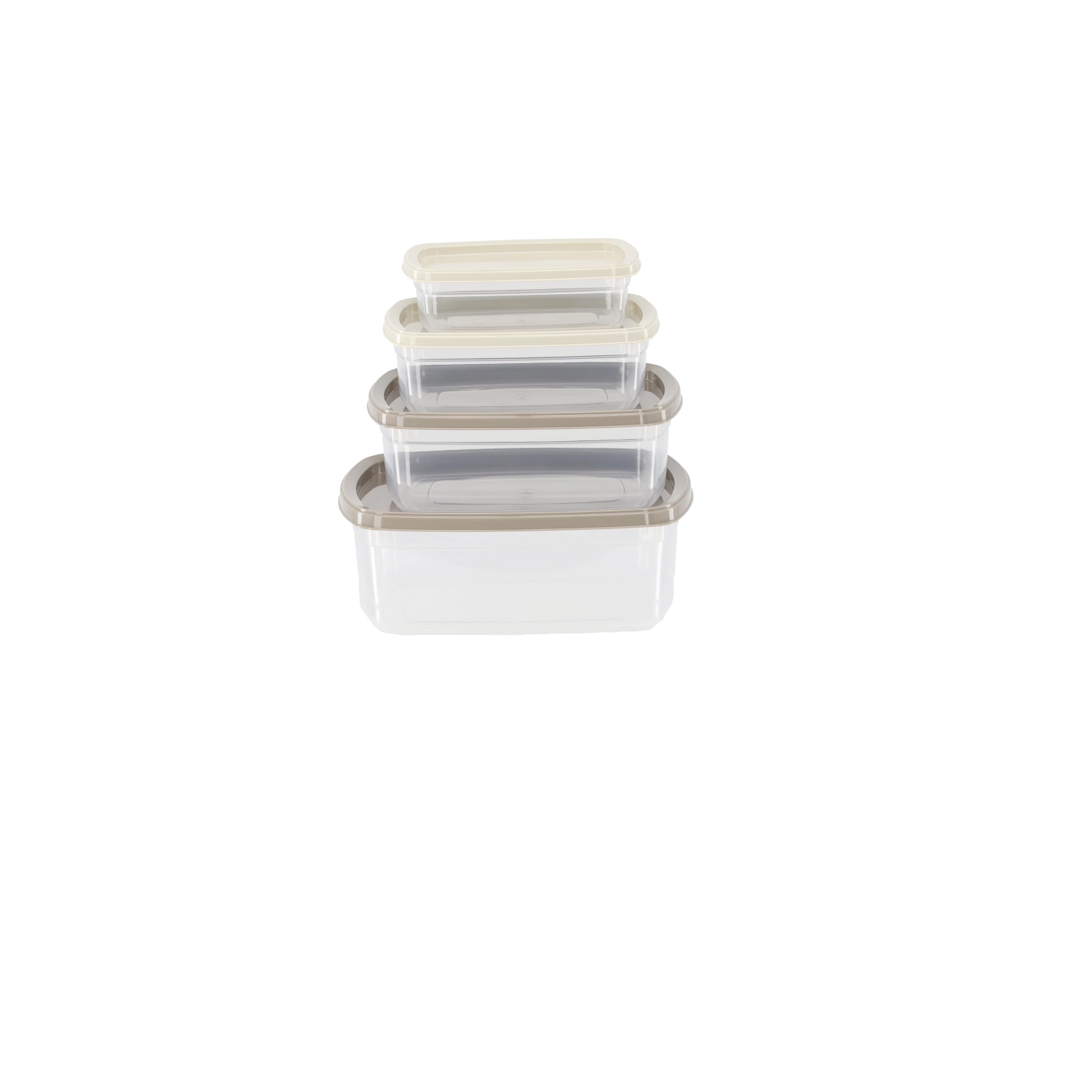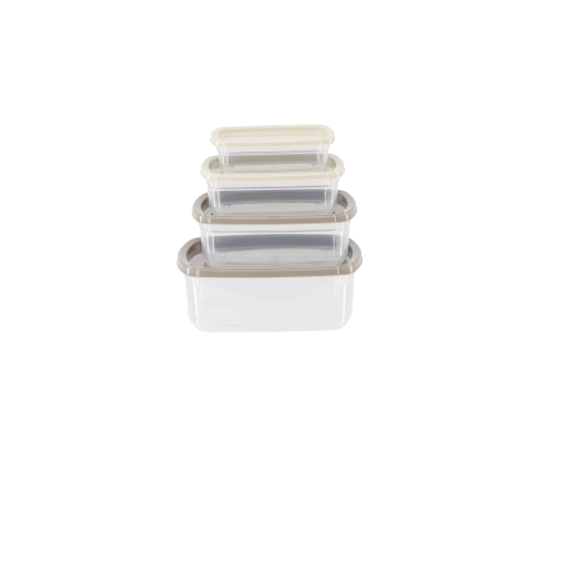 Praktisk sæt med fire rektangulære madkasser i størrelserne 0,25 l, 0,5 l, 0,75 l og 1,2 l til smart opbevaring i køkkenet. Takket være det gennemsigtige design ser du hurtigt indholdet, lufttætte låg hjælper med at holde maden frisk længere, og den stabelbare form sparer plads i både køleskab og spisekammer.