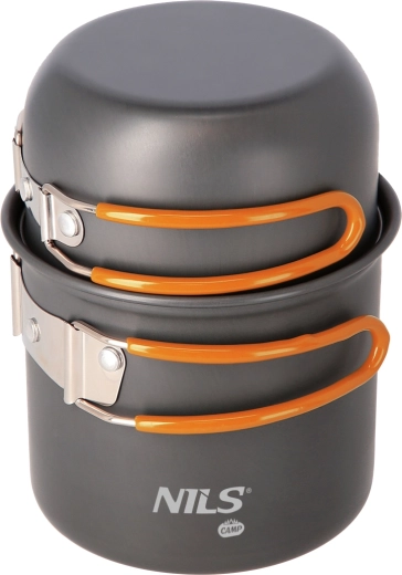 NILS Camp leverer et praktisk sæt kogegrej til vandring, camping og kanoture. Gryde og grydepan/pande af anodiseret aluminium modstår korrosion og vejrpåvirkning, og de foldbare håndtag i rustfrit stål med gummibeklædning øger grebssikkerheden. Takket være det stabelbare design og transportnettet pakkes sættet nemt og fylder næsten ingenting.