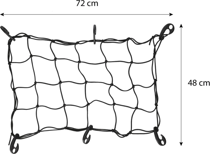 Grundstørrelsen 72 × 48 cm kan nemt strækkes efter behov. Den elastiske konstruktion holder lasten stabil uanset form.