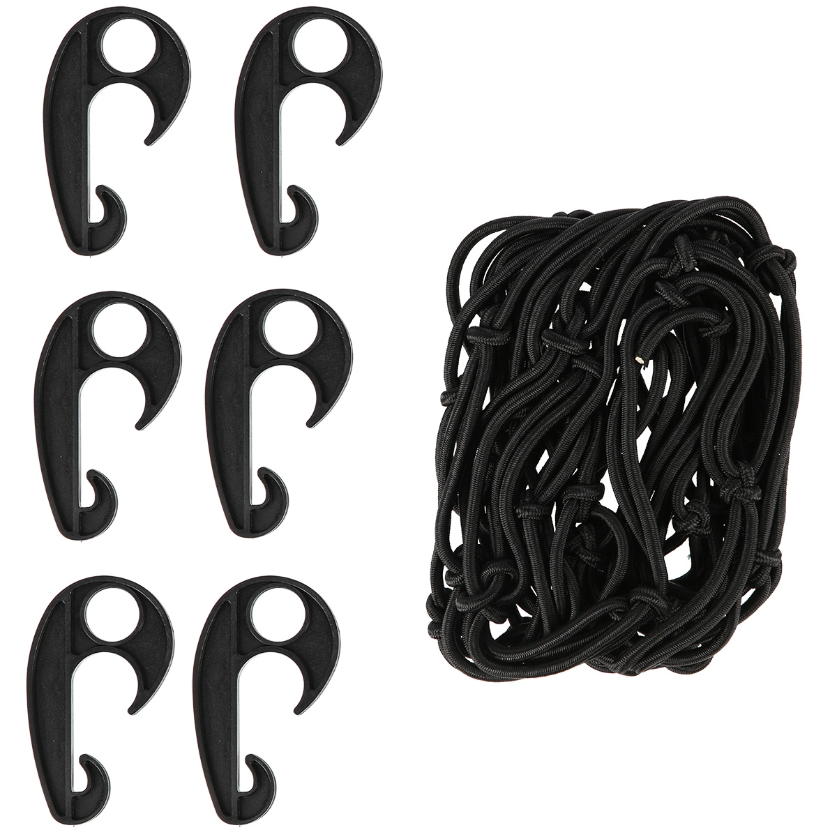 Pakken indeholder 6 plastkroge, som muliggør hurtig fastgørelse til trolleyøjer, bilbagagerum eller andre fastgørelsespunkter. Nettet er let, kompakt og klar til at hjælpe når som helst – på camping, på farten og derhjemme.