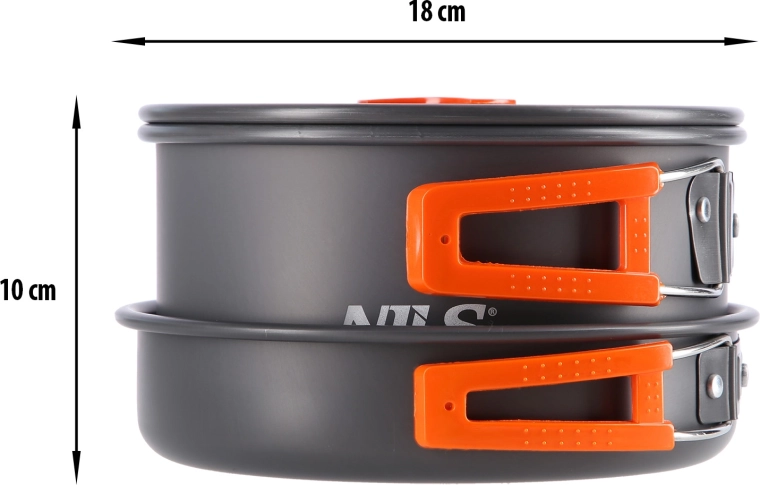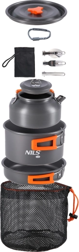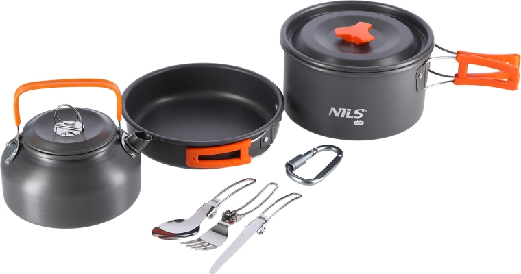 Det alsidige camping-kogegrejssæt NILS Camp er ideelt til vandreture, sejlads og camping. Sættet indeholder gryde med låg, pande, kedel og et sammenklappeligt bestik. Takket være robust aluminium med nonstick-belægning er madlavningen nem og hurtig, mens hele sættet er let, holdbart og kompakt. Klapbare håndtag med varmeisolering øger sikkerheden, og det kompakte design gør det muligt nemt at stable delene i hinanden. Inklusive transportpose og karabinhage til praktisk tørring og transport.