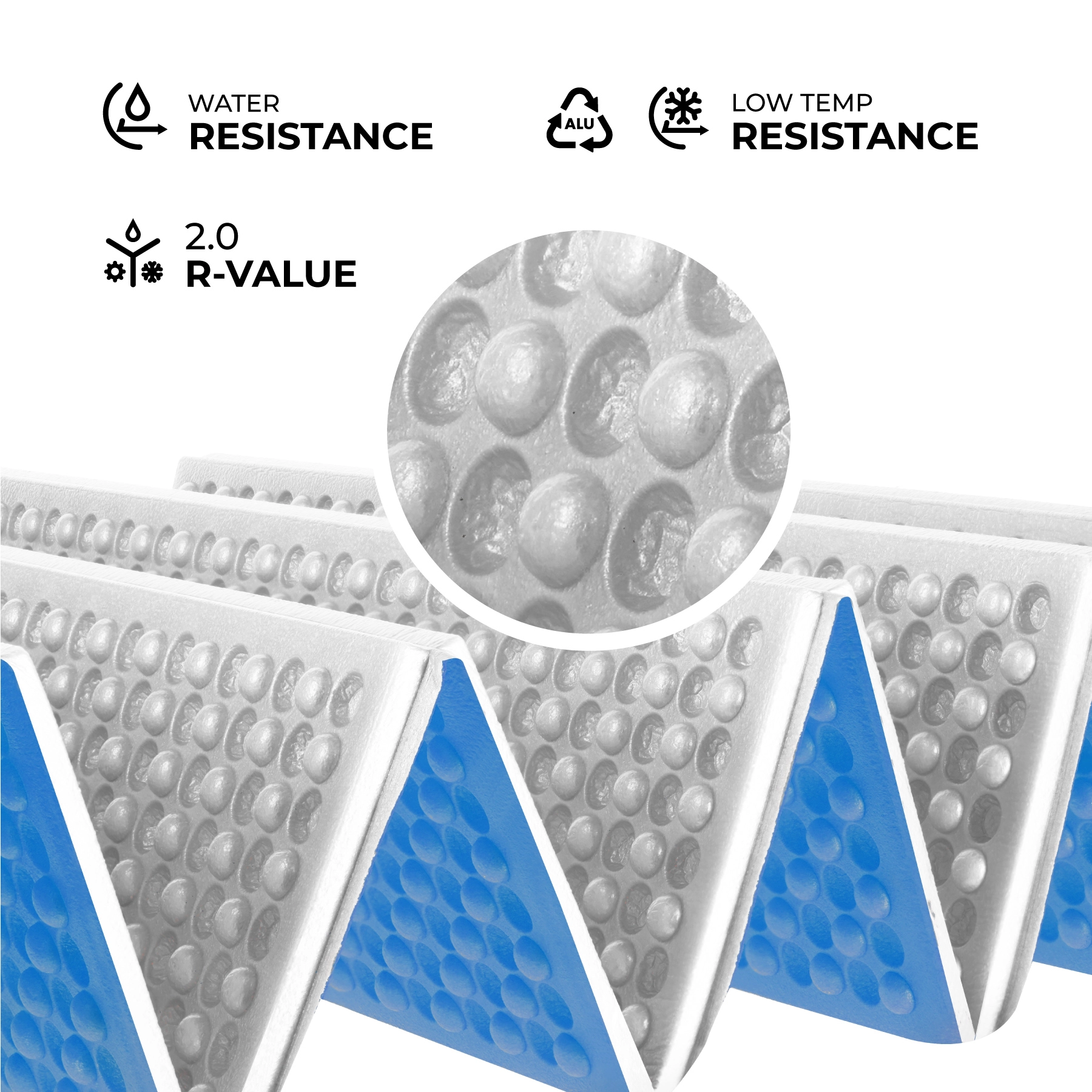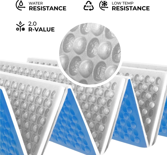 - Fremragende isolering takket være XPE-skum og aluminiumslag (R-Value 2,0)