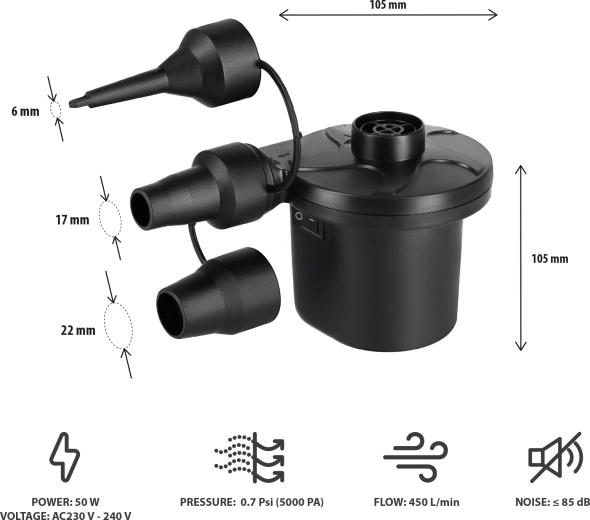 Det kraftige flow på 450 l/min og tryk op til 5 kPa sikrer lynhurtig oppumpning selv af større oppustelige genstande samt praktisk tømning for hurtig pakning.