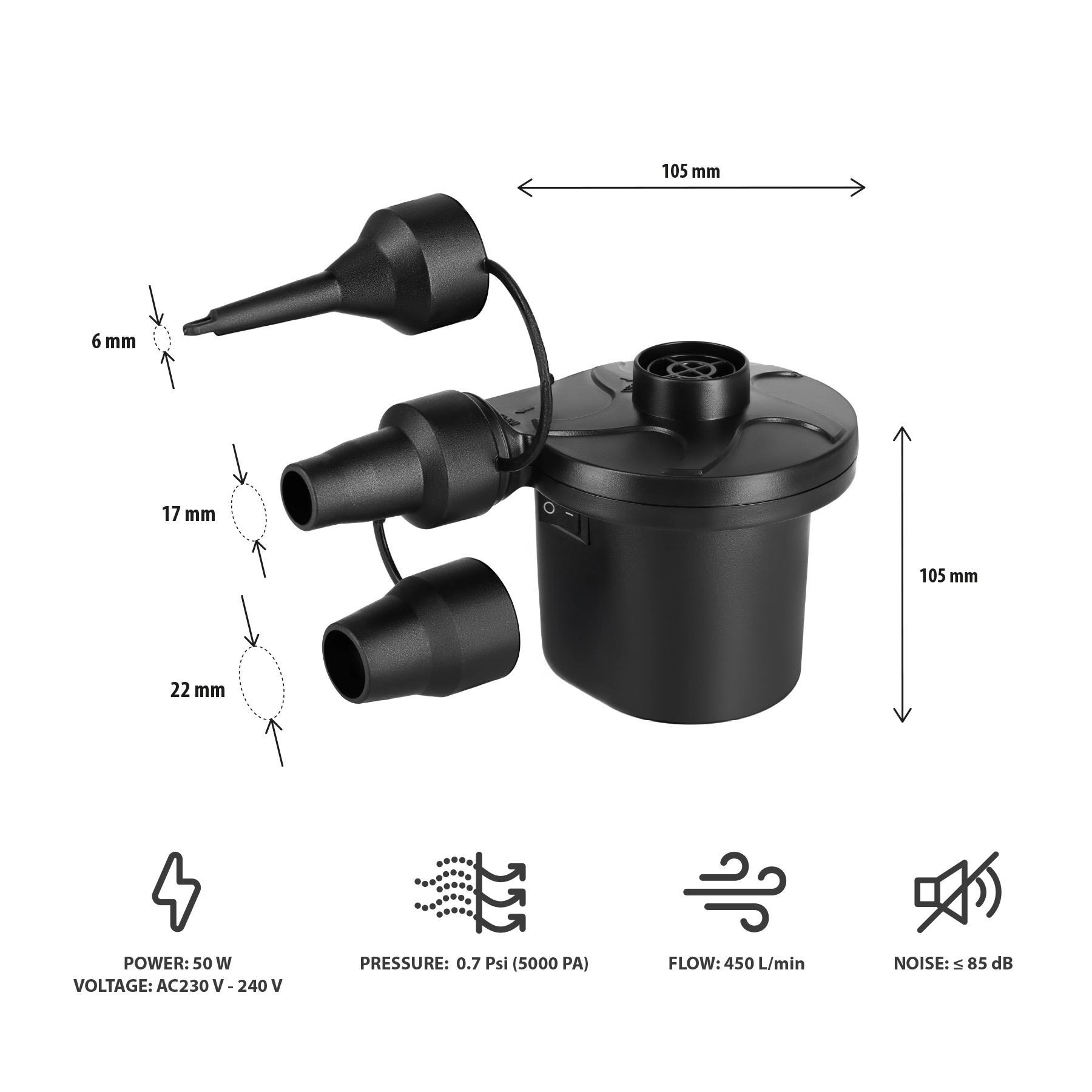 Sættet med dyser på 6, 17 og 22 mm dækker de fleste almindelige ventiler – fra baderinge og madrasser til oppustelige både og gymnastikbolde.