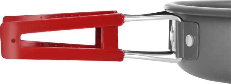 Praktisk håndtag med isoleret greb og metal-lås, der låses sikkert under madlavning og, når det foldes sammen, sparer værdifuld plads i rygsækken.