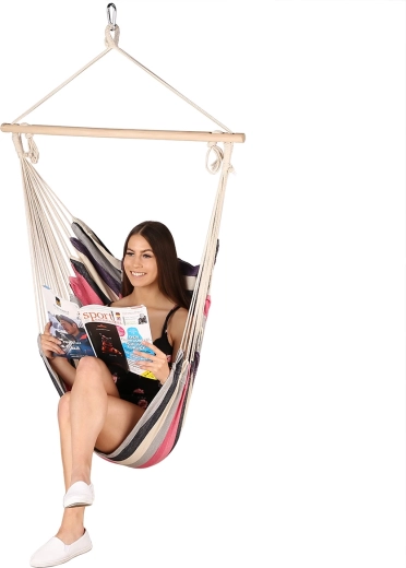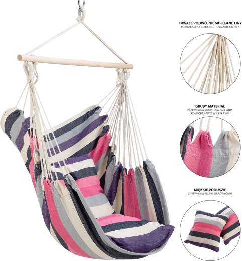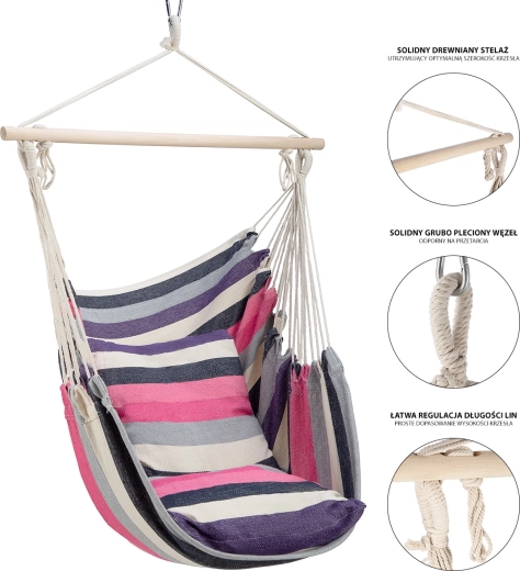 Den brasilianske hængestol NILS Camp i elegante pink striber giver behagelig siddestilling og blid gyngen for afslapning af krop og sind. Den tekstile del i T/C-lærred (60 % polyester, 40 % bomuld) er behagelig at røre ved, åndbar og samtidig modstandsdygtig over for slitage. Træstangen holder stolen åben og overskuelig for nem indstigning og sikker siddning.