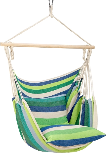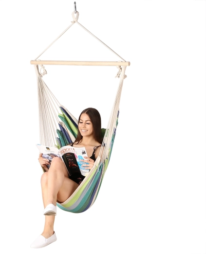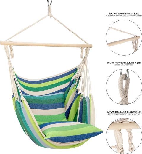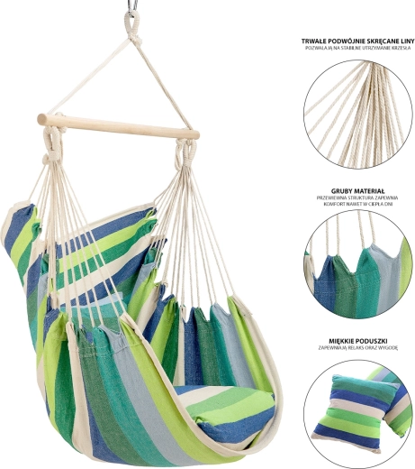 Nyd ultimativ afslapning både hjemme og ude med den hængende brasilianske stol NILS Camp i grønstribet design. Kombinationen af bomuld og polyester er behagelig at røre ved, åndbar og samtidig holdbar. Takket være den stabiliserende træstang, de stærke reb og de to bløde puder tilbyder stolen høj komfort og sikker gyngebevægelse. Maks. belastning 100 kg og nem ophængning gør den til et perfekt valg til have, altan og camping.