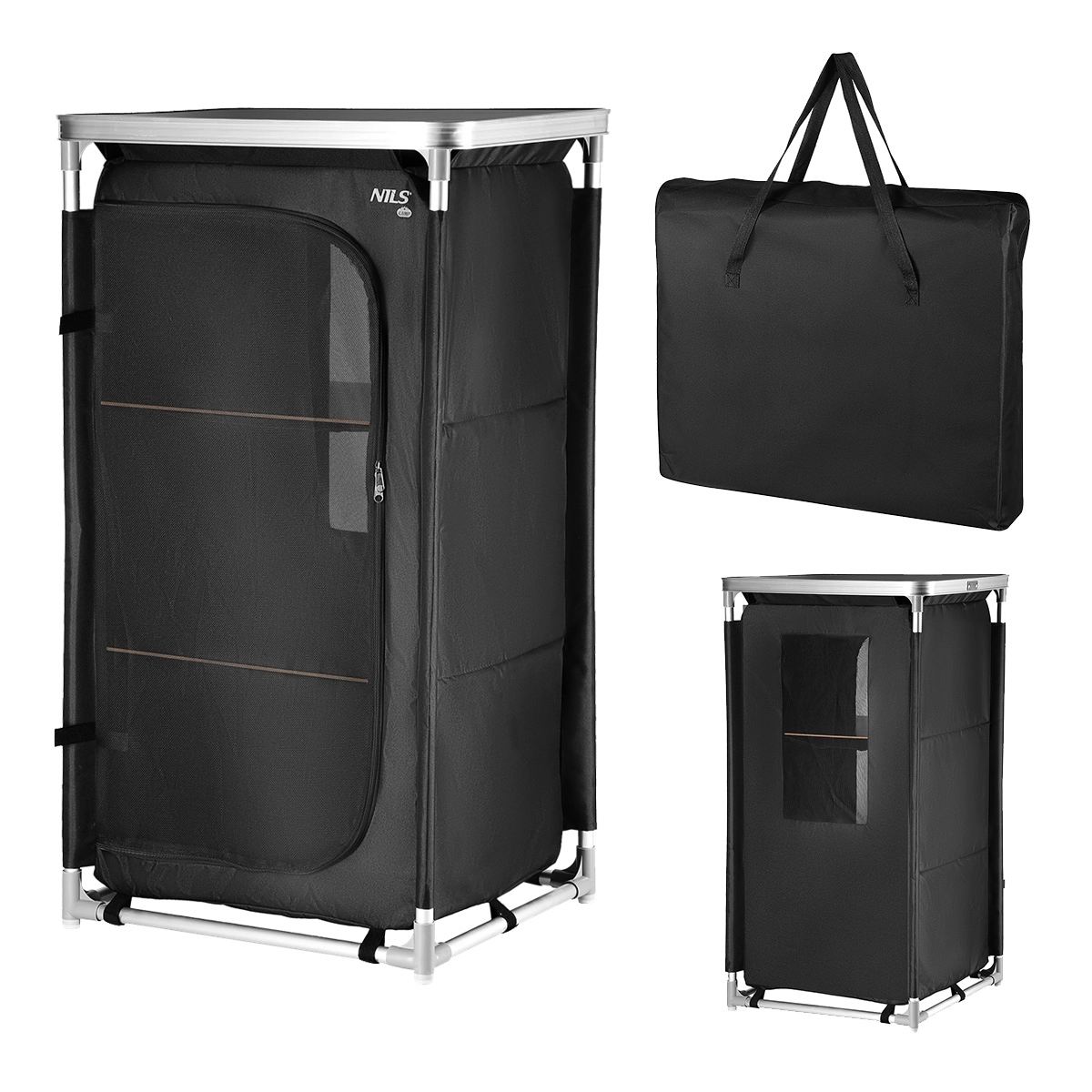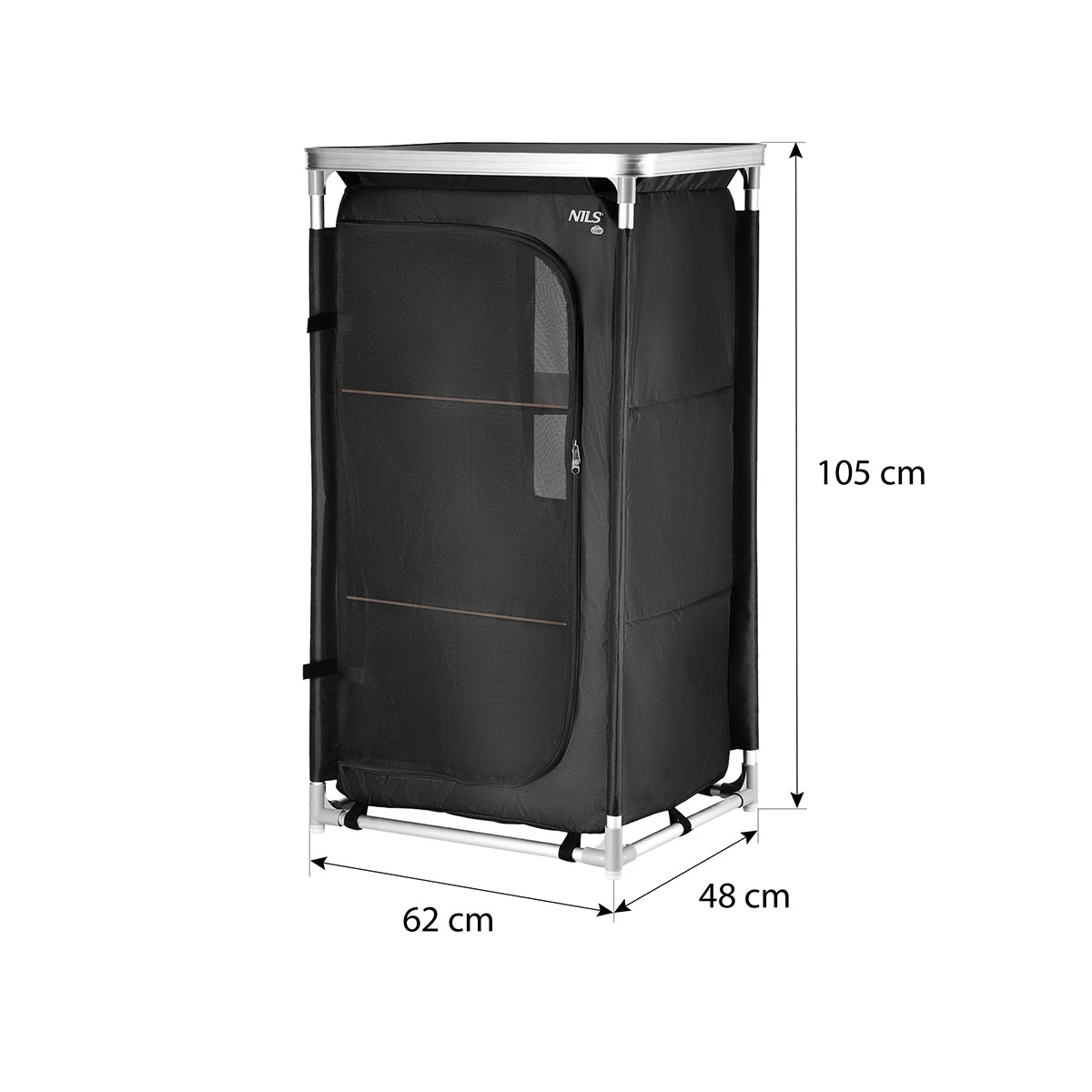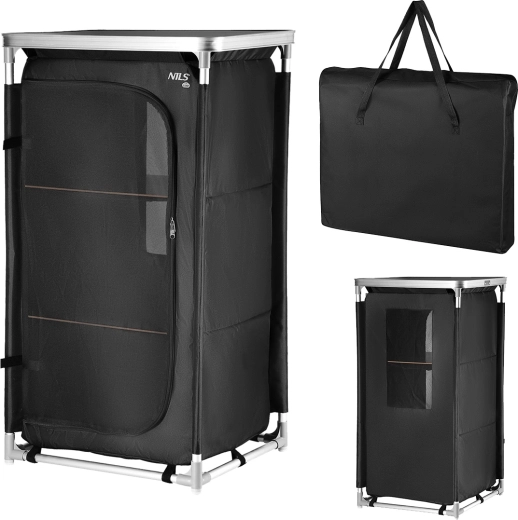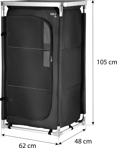 Dette kompakte camping-skab fra NILS CAMP skaber orden i ethvert telt. Den robuste ramme af aluminiumsrør med 19 mm diameter samles med holdbare plastkoblinger, mens særlige fodender øger stabiliteten på ujævnt underlag. Betrækket i Oxford 600D polyester er meget modstandsdygtigt over for slid og vejr. Frontpanelet af net sikrer luftcirkulation, kan rulles op og fastgøres med stropper eller lukkes med tovejslynlås.