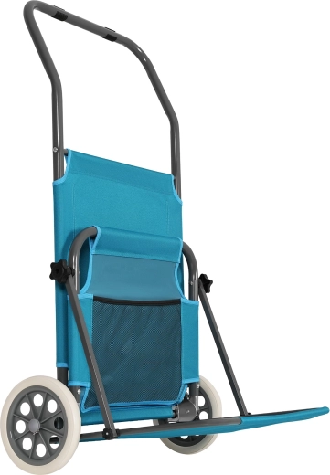 Liggestolen løftes blot foran og trækkes som en vogn. De store hjul klarer sand, græs og ujævnheder.