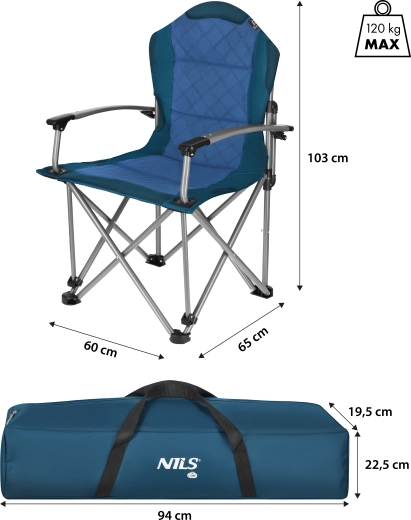 Robust og komfortabel sammenklappelig NILS Camp-stol til camping, fiskeri og havebrug, med høj ryglæn, brede armlæn og blød polstring. Stabil stålramme, slidstærkt betræk 600D Oxford, bæreevne 120 kg og hurtig sammenklapning til transporttaske gør denne stol til et ideelt valg for afslappet komfort i naturen.