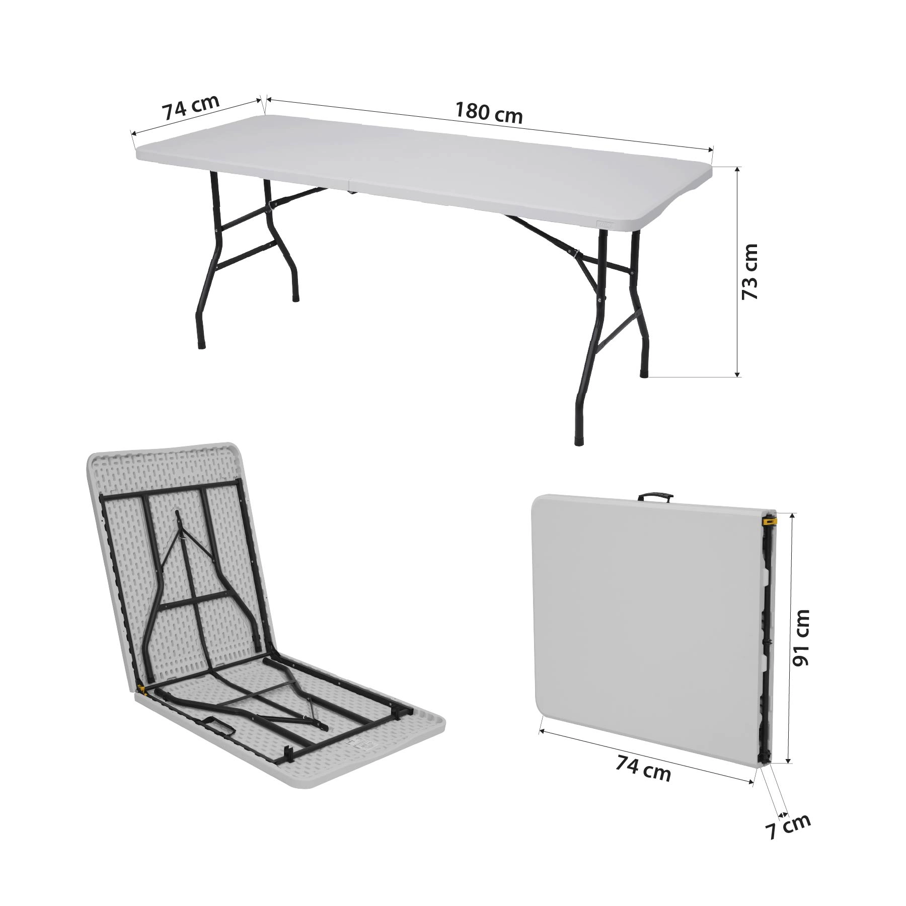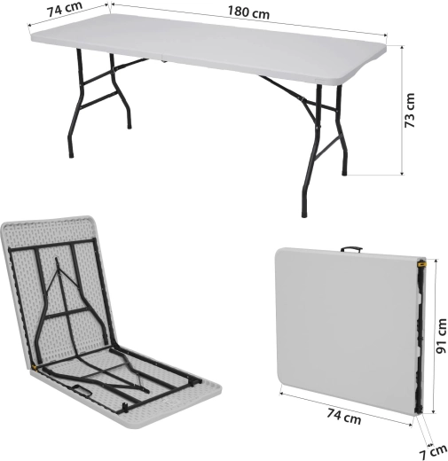 Den generøse flade på 180 × 74 cm giver rigelig plads til gæster, forfriskninger og udstyr. Den ergonomiske højde på 73 cm er behagelig både til at sidde og arbejde stående. Et praktisk sammenklappeligt system forvandler bordet til en kompakt “kuffert” med transporthåndtag, så du nemt kan opbevare det i bilen, skabet eller under sengen.