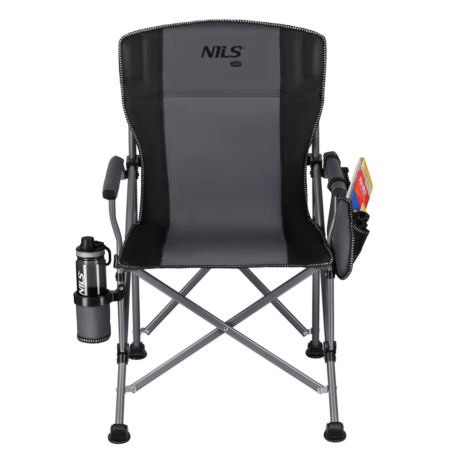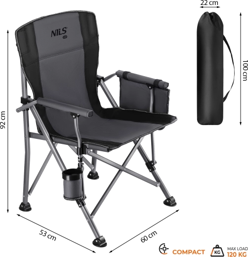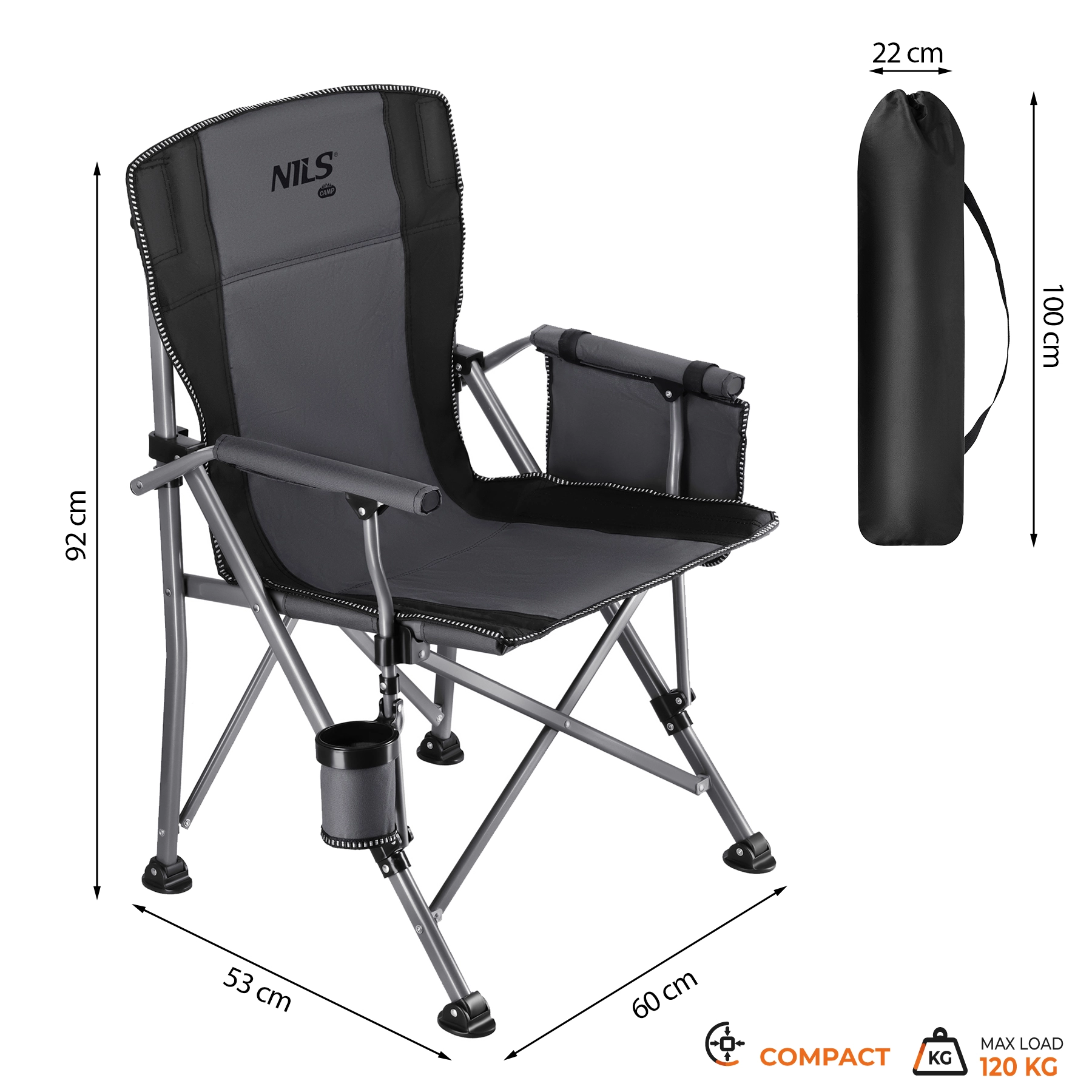 Den lette og robuste sammenfoldelige stol NILS Camp er ideel til fiskeri, camping og haven. Den tilbyder hurtig udfoldning, stålkonstruktion, behagelig siddekomfort og praktiske detaljer som kopholder, 3 lommer og transporttaske. Maksimal belastning 120 kg og universelt grå‑sort design.