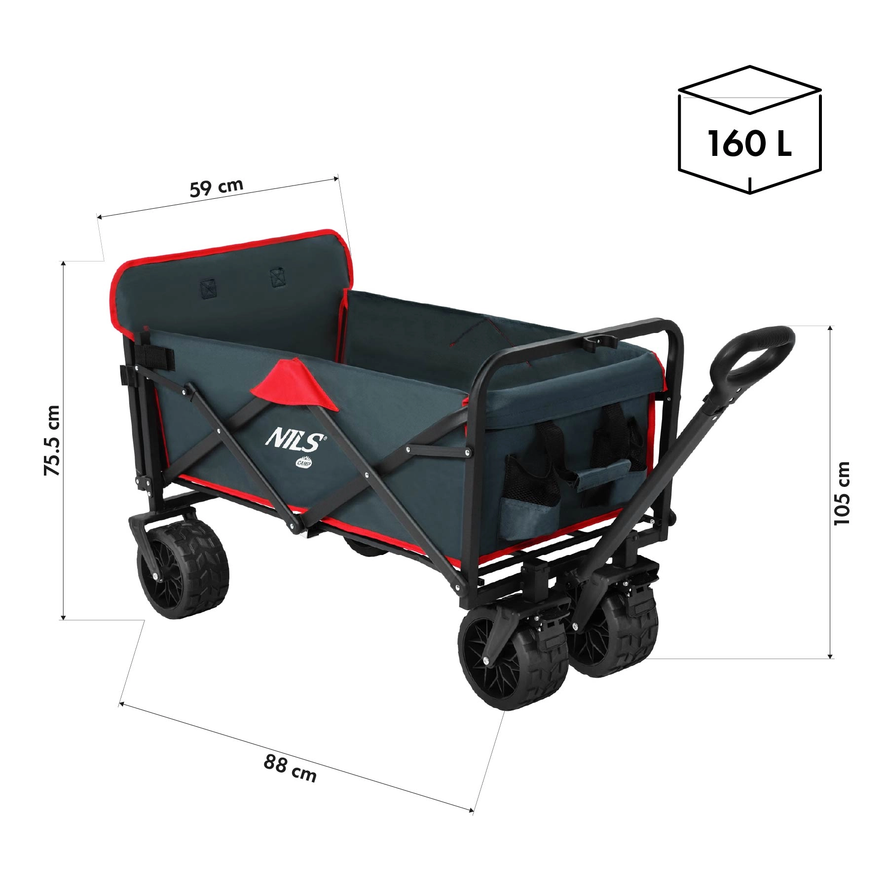 Praktisk sammenklappelig vogn til camping, udflugter og indkøb med en bæreevne på 100 kg og et rumfang på 160 l. Den byder på stærk stålrams konstruktion, holdbart 600D Oxford-tekstil, brede terrænhjul, justerbart håndtag og kompakt sammenklapning for nem opbevaring.