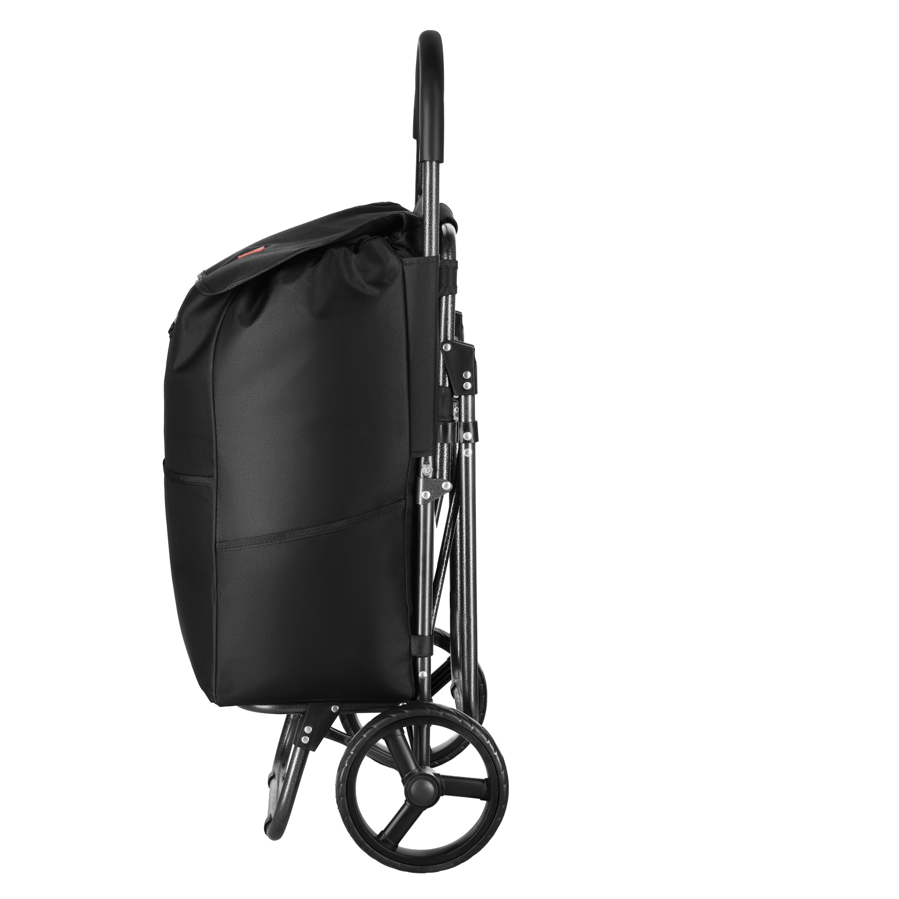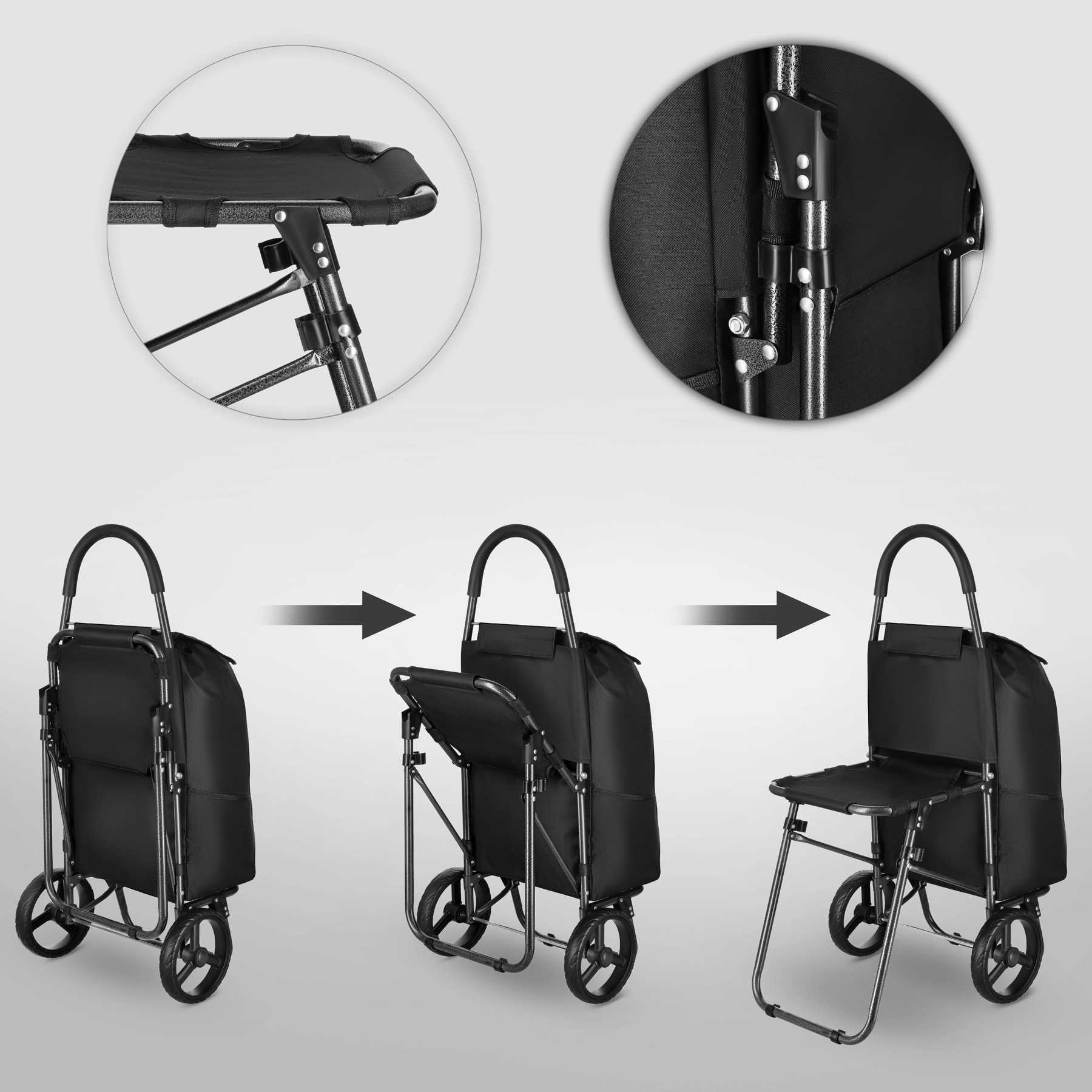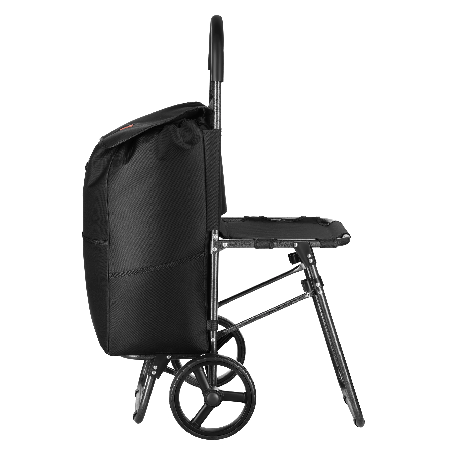 En unik fordel er det sammenklappelige sæde, som lader dig hvile når som helst – både i køen og på gåturen. Hovedrummet har snørelukning og klap med spænde for sikker opbevaring af indkøbene, mens 3 udvendige lommer rummer de småting, du vil have ved hånden. Tasken er let at tage af takket være velcro, og den forstærkede bund forbedrer stabiliteten ved pakning.