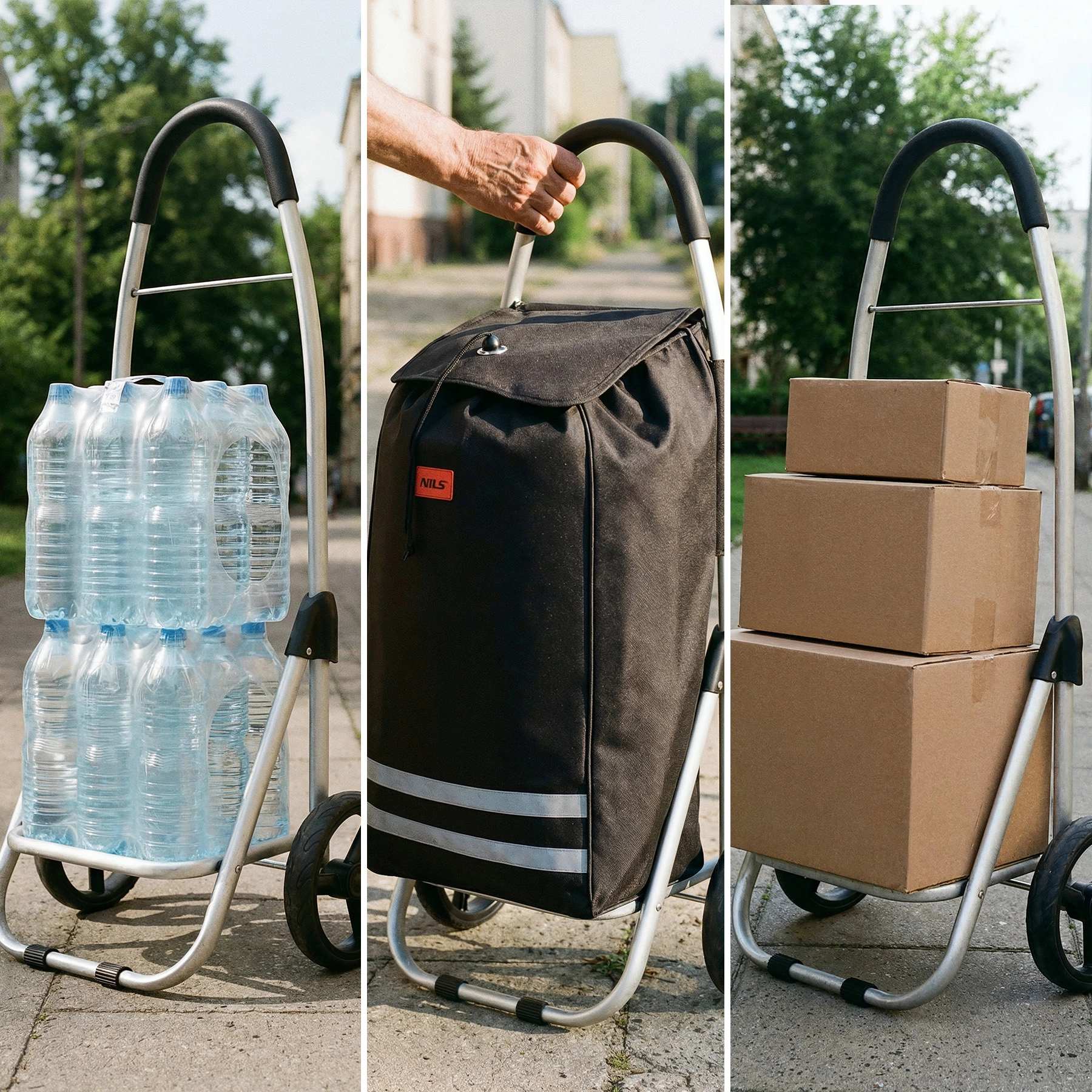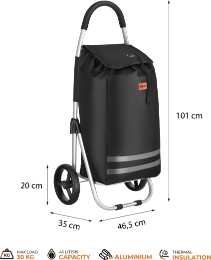 Indkøbsvognen NILS er en gennemtænkt hjælper til daglige indkøb. Den slidstærke taske i 900D polyester med indvendigt termisk isoleringslag holder varerne friske længere, mens aluminiumsrammen sørger for stabilitet med lav vægt. Hovedrummet med snøre-lukning og klap beskytter sikkert indholdet mod at falde ud og mod regn.