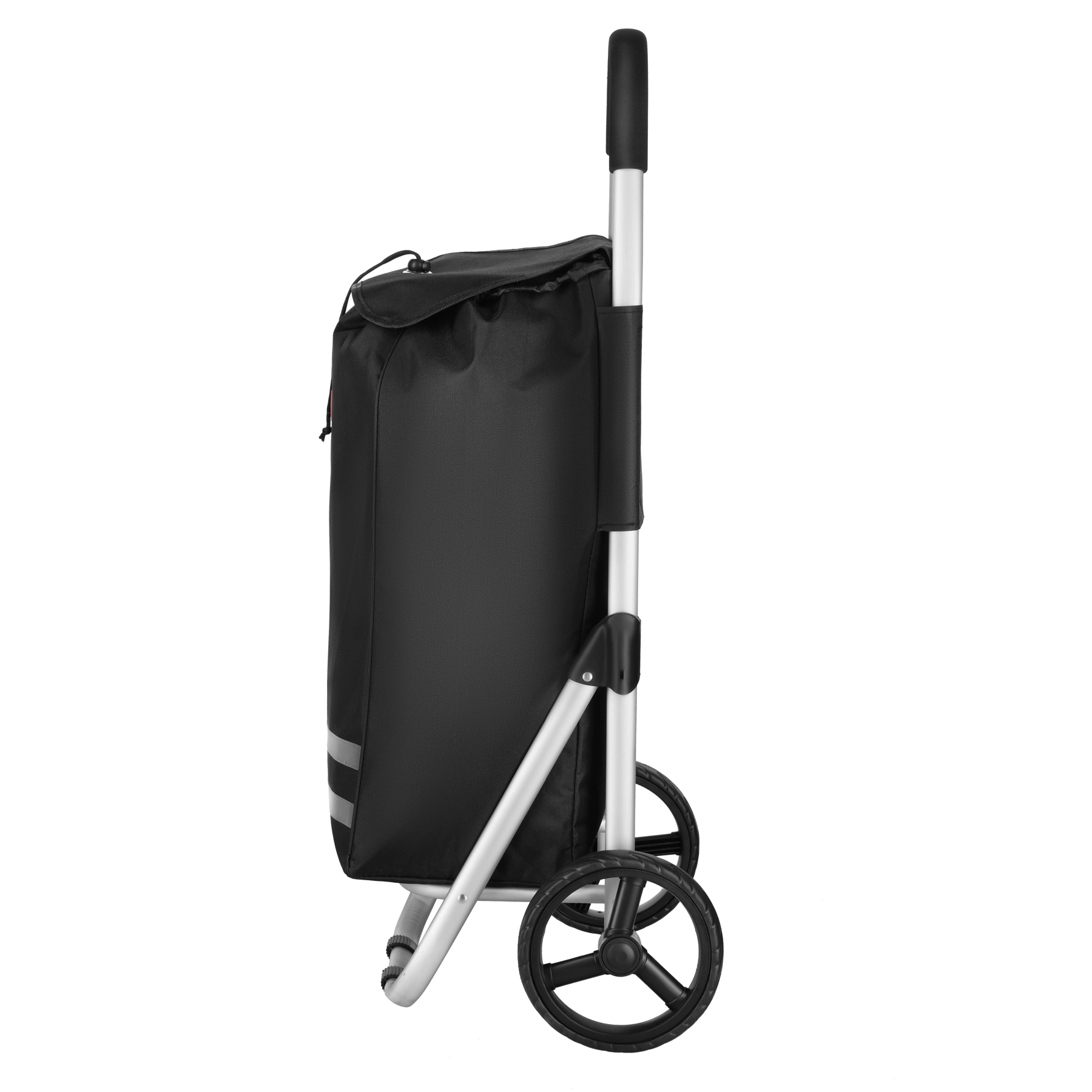 Takket være de store 20 cm hjul er vognen let at manøvrere på fortov, brosten og mellem hylder. Det skumpolstrede håndtag er behageligt at holde om – også ved fuld belastning. Der er ydre lynlåslomme til småting samt reflekser for bedre synlighed.