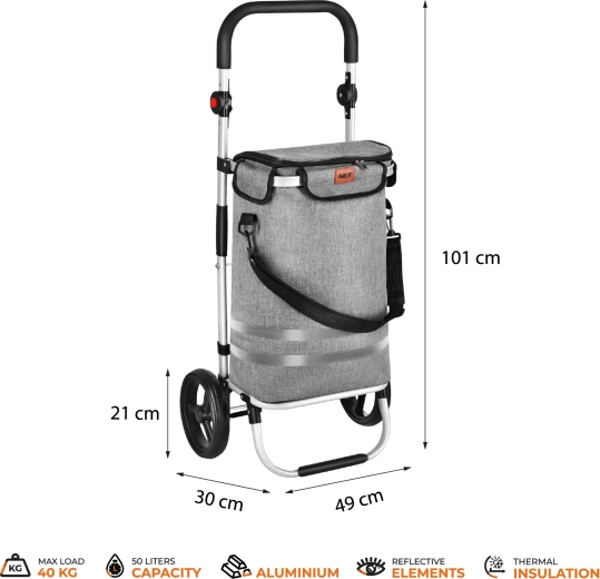 Du kan nemt klare selv et stort indkøb takket være en kapacitet på 50 liter og en bæreevne på op til 40 kg. Den lette aluminiumsramme giver stabilitet og lav vægt for nem håndtering.
