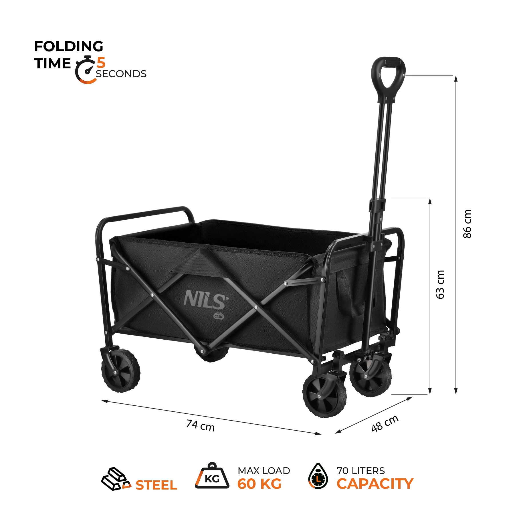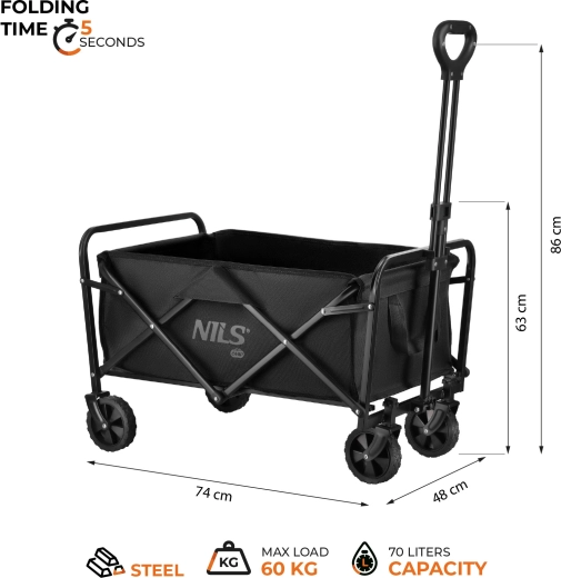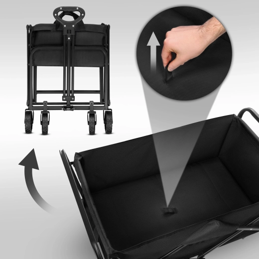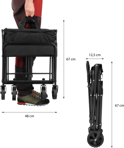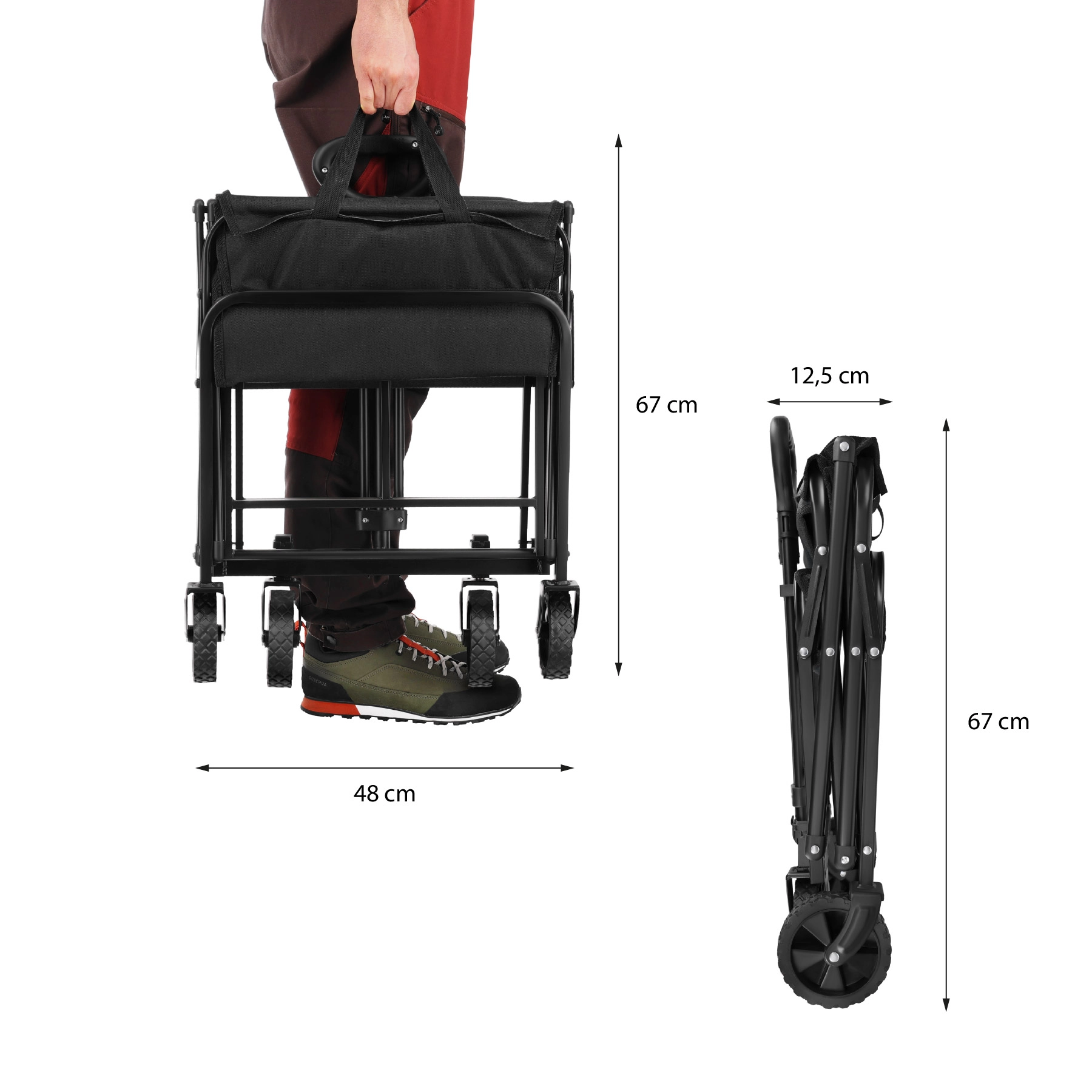 Vognen er ideel til camping, picnic, vandreture og strand. Du kan lægge håndklæder, sportsudstyr, indkøb eller børnetilbehør i den og transportere det hele på én gang uden unødvendig anstrengelse. Det slidstærke stof 600D Oxford med PVC beskytter indholdet mod fugt og snavs, så den egner sig til terræn, græs og sand.