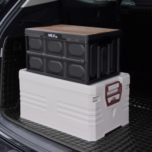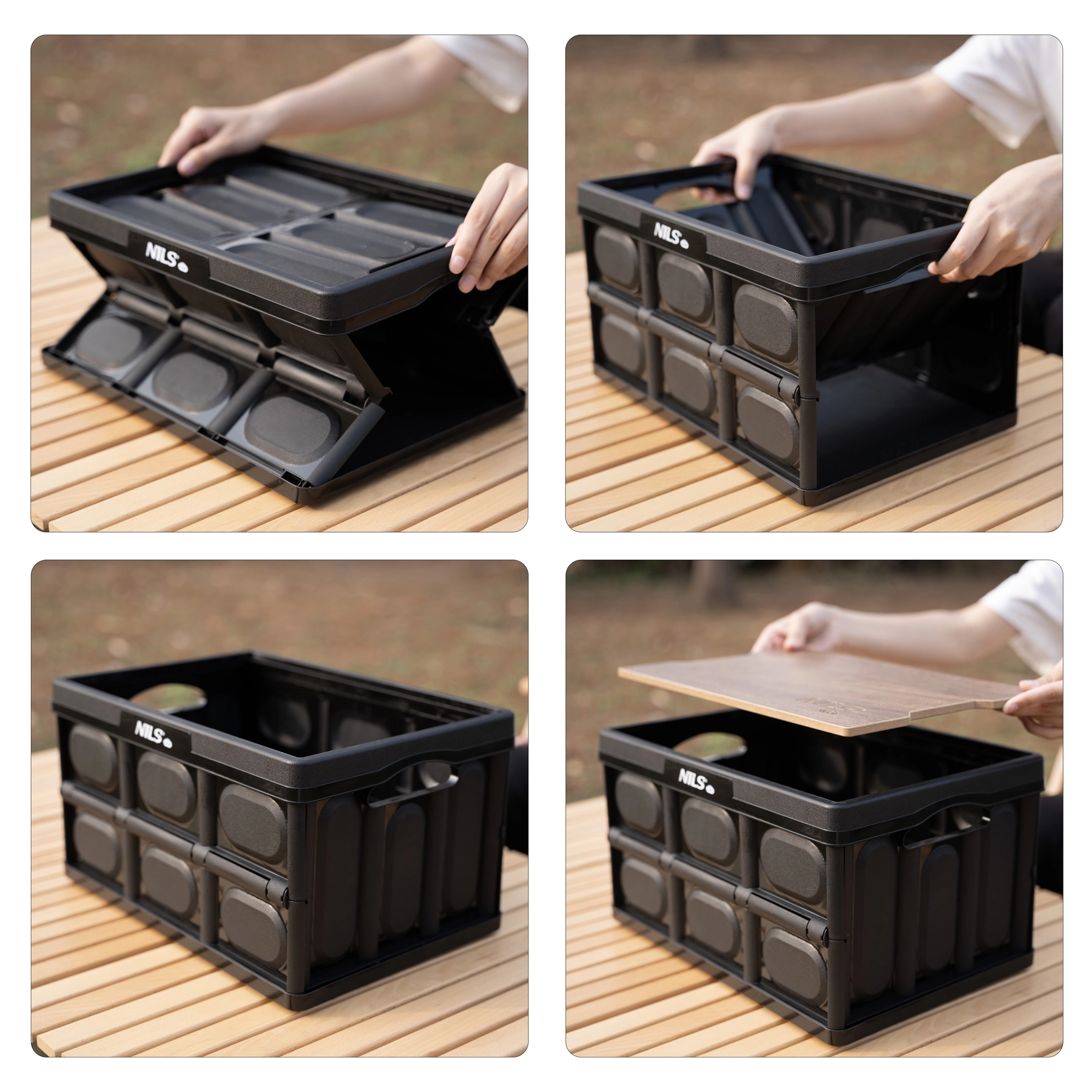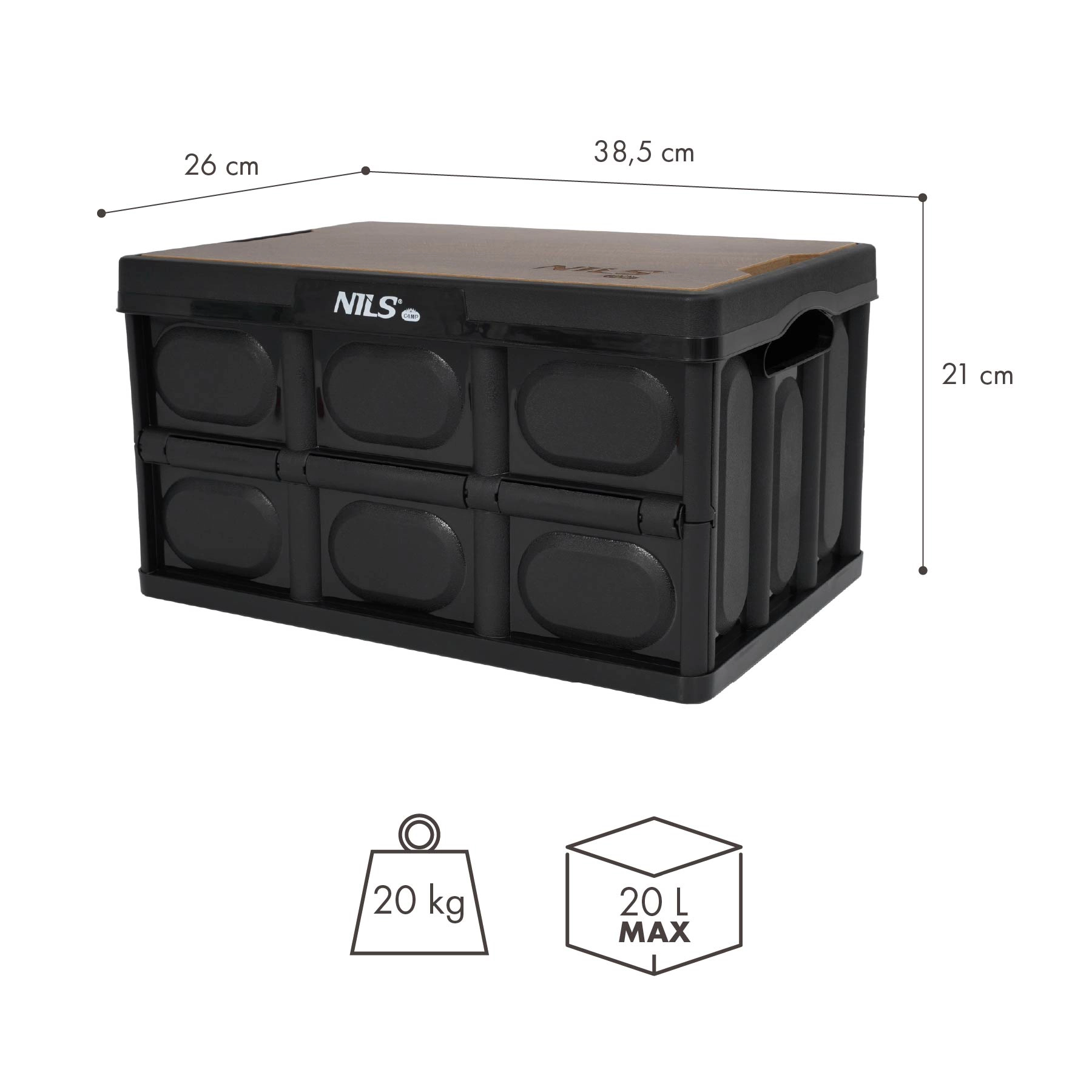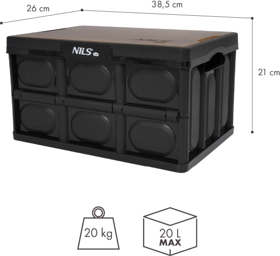 Den praktiske, sammenklappelige NILS Camp-kasse med et volumen på 20 l og et robust trælåg fungerer både som opbevaringsboks og stabilt bord. Den er let, kan klappes sammen til 5 cm, stabelbar og fremstillet af holdbar polypropylen, så den er ideel til bilen, hjemmet, camping og værkstedet.