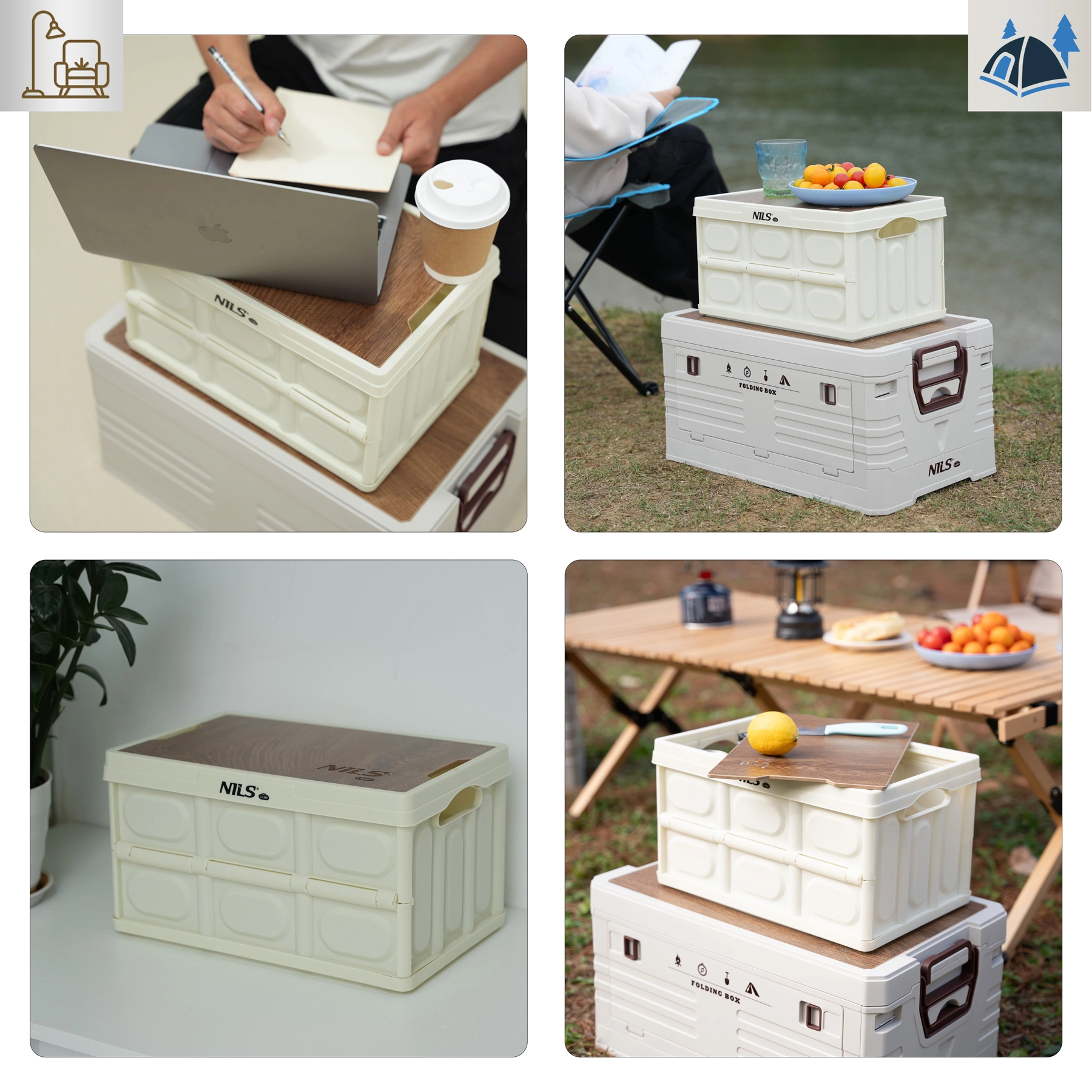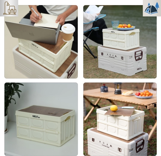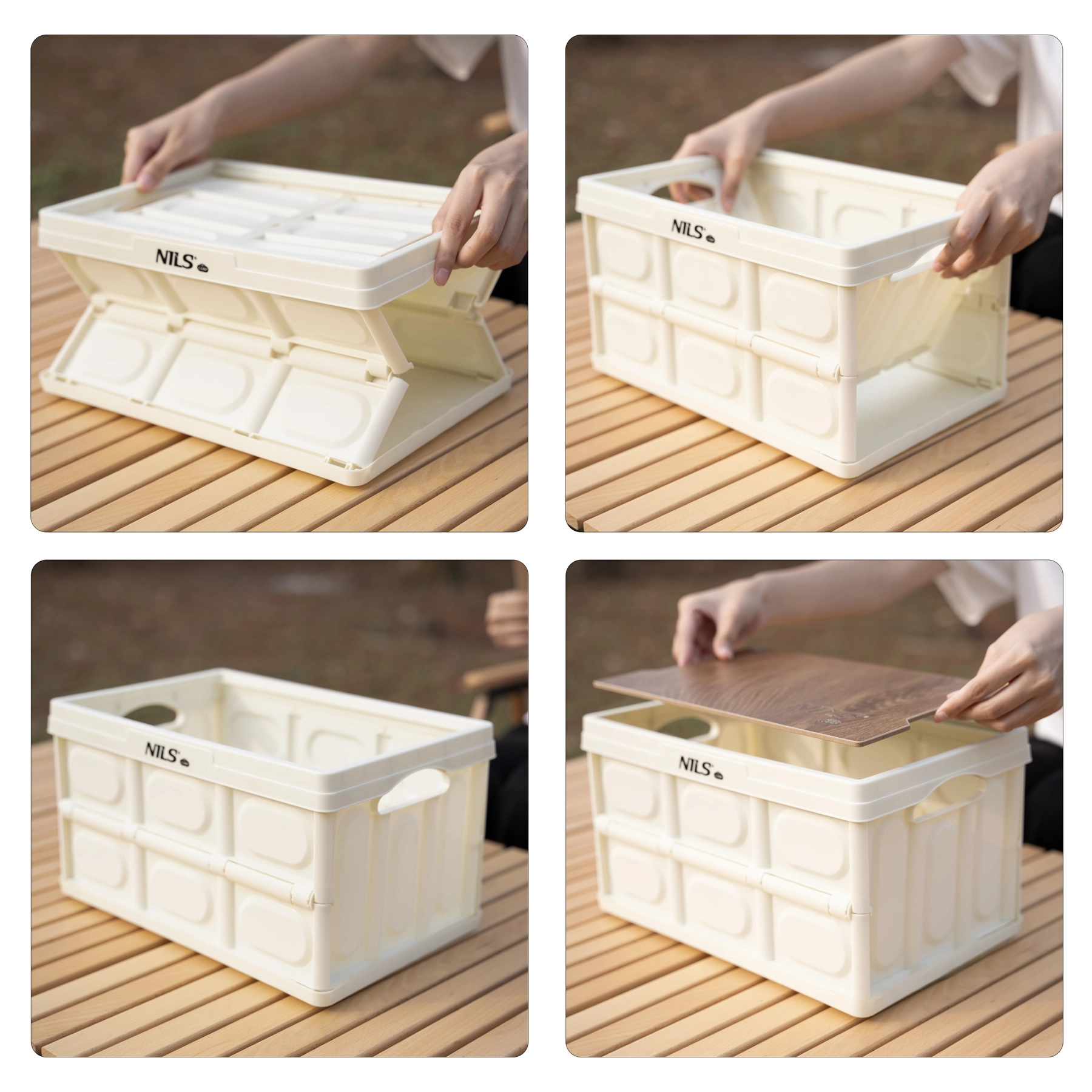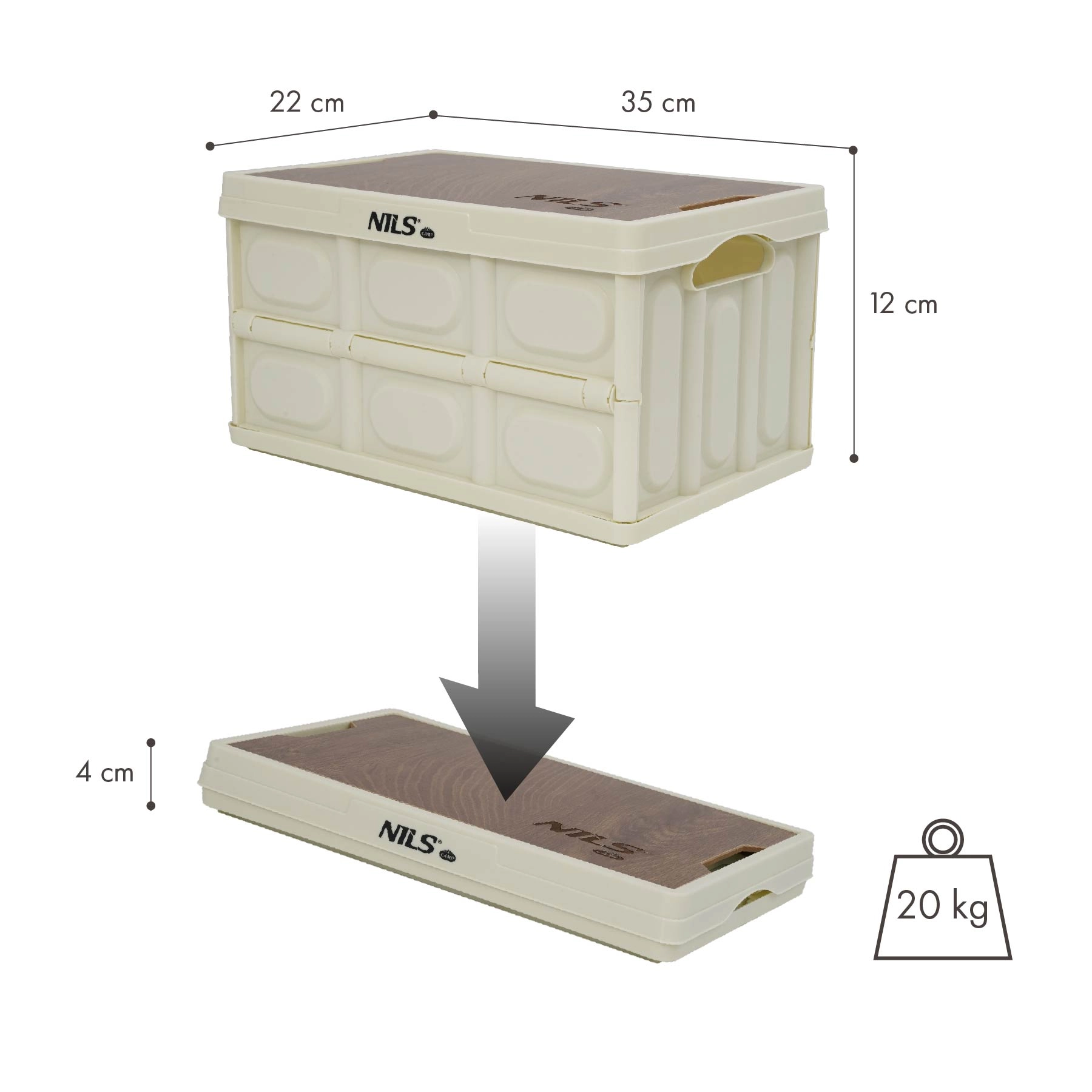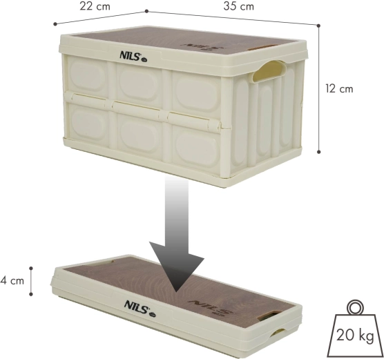 Den praktiske, sammenklappelige kasse NILS Camp med volumen på 9 l og et solidt låg i trælook fungerer både som opbevaringsboks og lille bord. Takket være sammenklappelig konstruktion til 4 cm, lav vægt og stablebart modulært design er den ideel til bilen, hjemmet, camping og værkstedet. Bæreevne op til 20 kg og holdbar polypropylen sikrer lang levetid.