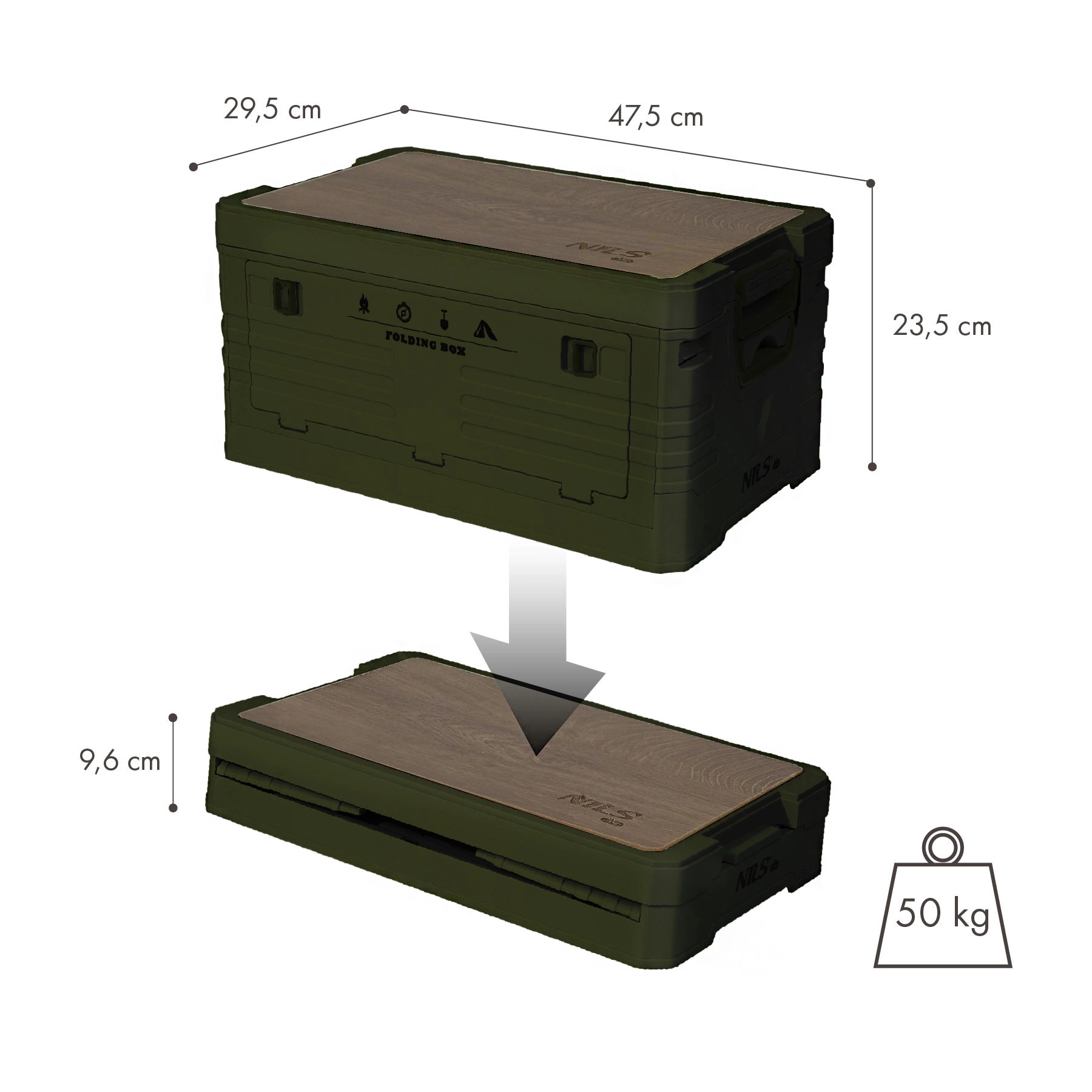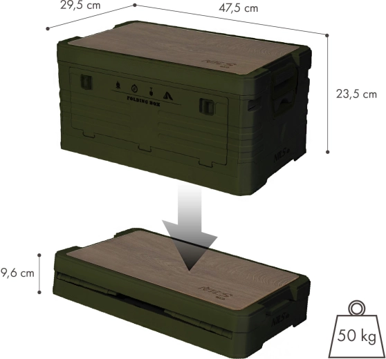 Den praktiske, sammenklappelige boks fra NILS Camp med en kapacitet på 32 l kombinerer opbevaringsplads og en aftagelig træplade, så den kan bruges som bord eller arbejdsflade. Takket være den stærke PP-konstruktion, det stabelbare design og den kompakte højde på 9,6 cm i sammenklappet tilstand er den ideel til bil, garage, hjemmet og camping. Bæreevne 50 kg og ergonomiske greb sikrer komfortabel og sikker brug.