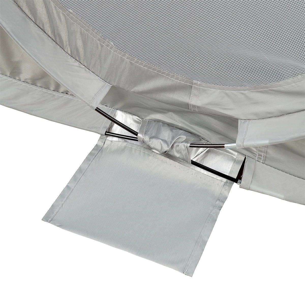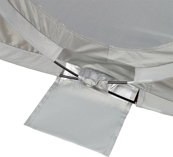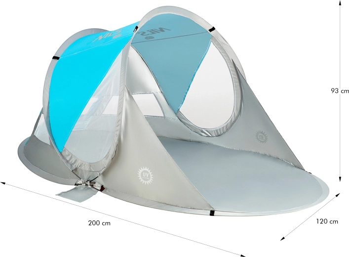 Takket være UV-refleksion på 96 % giver teltet effektiv beskyttelse mod skadelige solstråler. Gulvet med målene 200 × 120 cm og en højde på 93 cm giver rigelig plads til at sidde og til børns leg. Efter brug kan teltet nemt foldes sammen med en enkel bevægelse tilbage i den kompakte pose med en diameter på 60 cm – ideelt til bekvem transport og opbevaring.