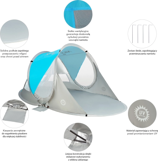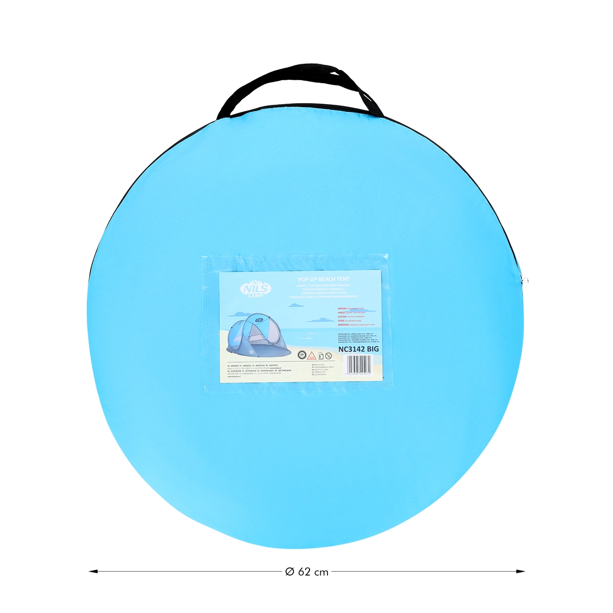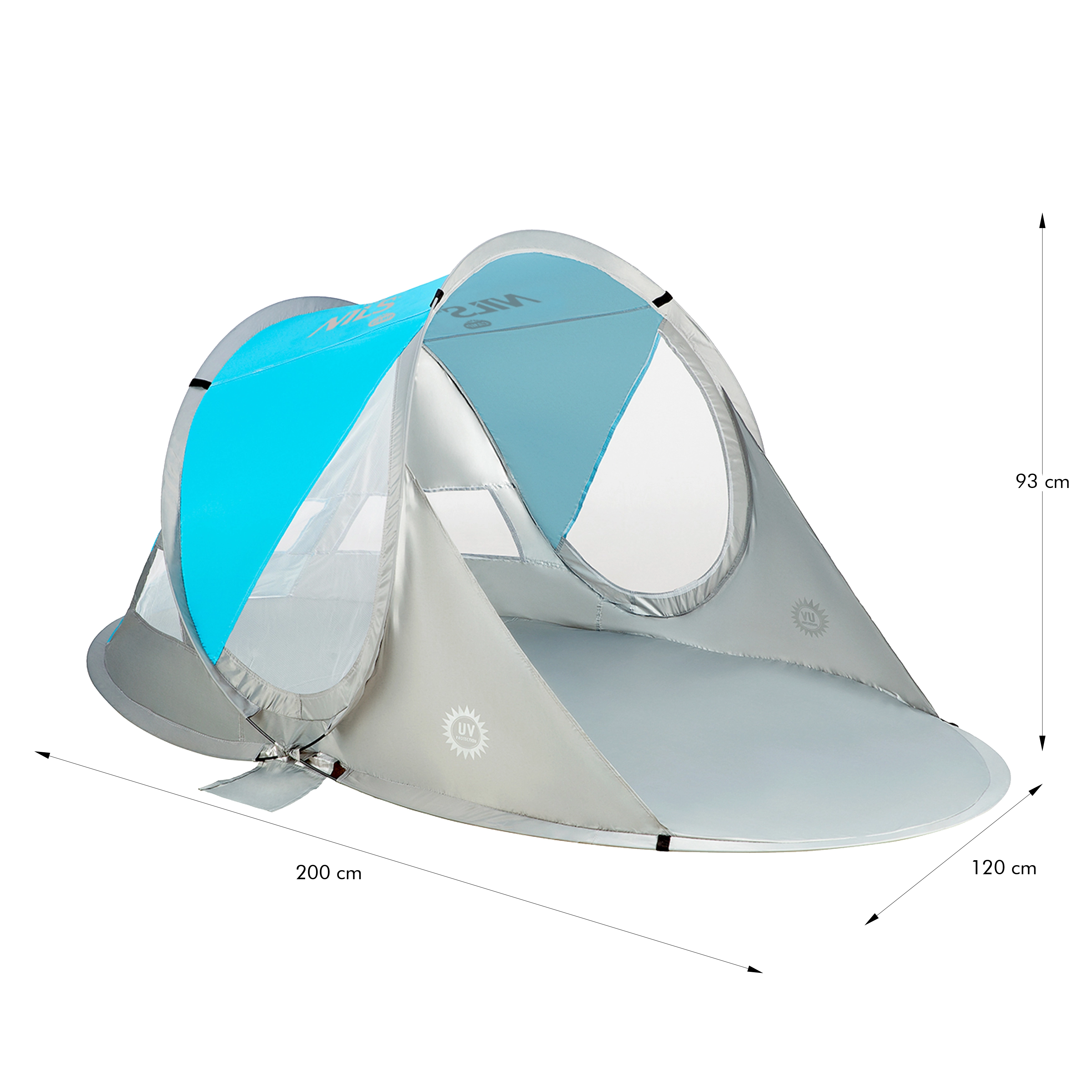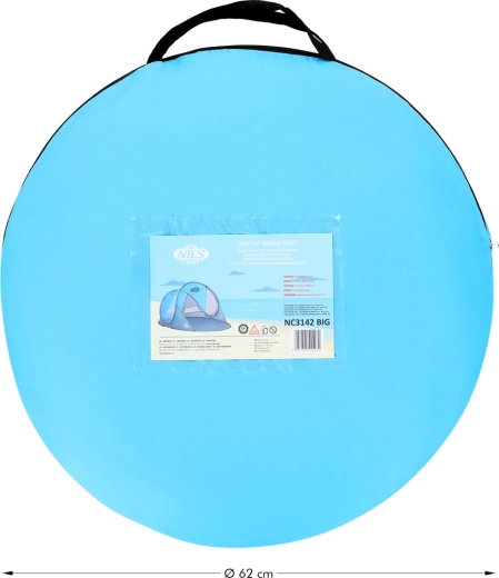 Nyd komfort og sikkerhed på stranden eller ved poolen med det selvopslående telt NILS Camp NC3143 BIG. Det tilbyder øjeblikkelig opsætning, beskyttelse mod UV-stråling op til 96 %, skygge og læ samt nem transport i en rund taske. Med målene 200 × 120 × 93 cm passer det til både børn og voksne, og den holdbare polyesterdug klarer også en let byge.