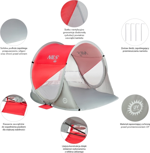 Nyd komfort og beskyttelse mod solen med NILS Camp strandtelt, som folder sig ud på et øjeblik, er let og holdbart og giver effektiv UV‑beskyttelse op til 96 %. Ideelt til stranden, friluftsbadet og haven – det giver behagelig skygge, læ for vinden og et komfortabelt opholdsområde for både børn og voksne.