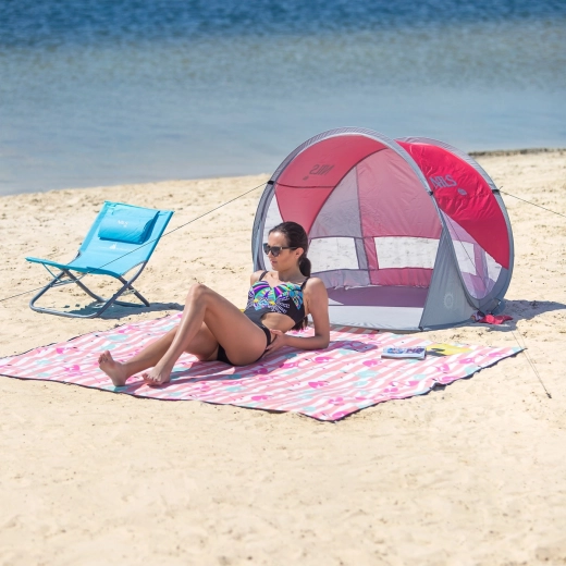 Teltet åbner sig automatisk, når det tages ud af tasken, og pakkes lige så nemt sammen igen – ideelt til hurtige skift og afslappede dage ved vandet.