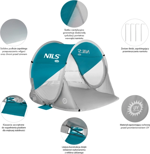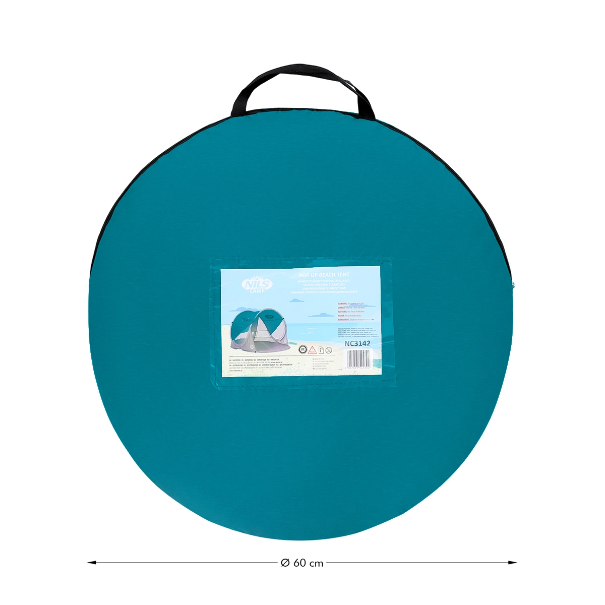 Nyd en bekymringsfri dag ved vandet med NILS Camp-teltet, som slår sig selv op på et øjeblik, giver effektiv UV-beskyttelse op til 96 % og skaber behagelig skygge og læ. Den lette konstruktion, den bærbare runde taske og de holdbare materialer gør det til et ideelt ly på stranden, ved badeanstaltet og i haven.