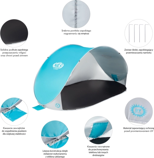 Nyd skygge og privatliv hvor som helst ved vandet. Det selvopslående strandtelt NILS CAMP NC3174 åbner sig selv, når det tages ud af den runde bæretaske med hank, og skaber en behagelig ly på få sekunder. Gulvarealet på 120 × 220 cm og højden på 100 cm giver plads til både børn og voksne, mens materialer af høj kvalitet sikrer komfort og lang levetid.