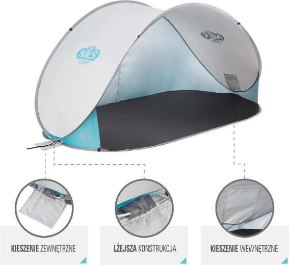 Det selvopslående strandtelt NILS Camp grå er det ideelle valg til stranden, friluftsbadet eller ved hjemmebassinet. Takket være den automatiske opsætning er det klar på få sekunder, mens beskyttelsesdugen af polyester med UV‑lag reflekterer op til 96 % af skadelig UV‑stråling. En praktisk rund taske med hank gør det nemt at bære og opbevare.