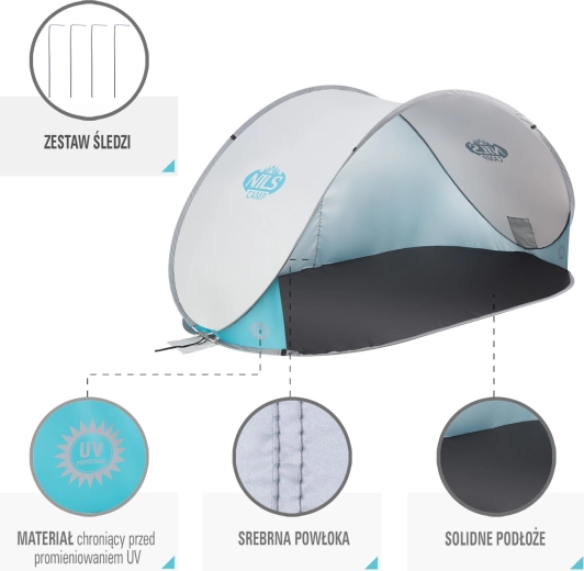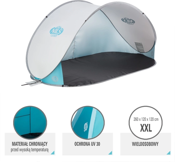 Nyd komfort og solbeskyttelse hvor som helst med dette selvopslående strandtelt fra NILS Camp. Teltet folder sig ud selv, så snart det tages ud af tasken, har en rummelig bund på 120 × 220 cm og en højde på 100 cm, reflekterer op til 96 % af UV‑strålingen og byder på hurtig og nem sammenpakning. Let og slidstærkt materiale sikrer pålidelig beskyttelse selv under en let byge.