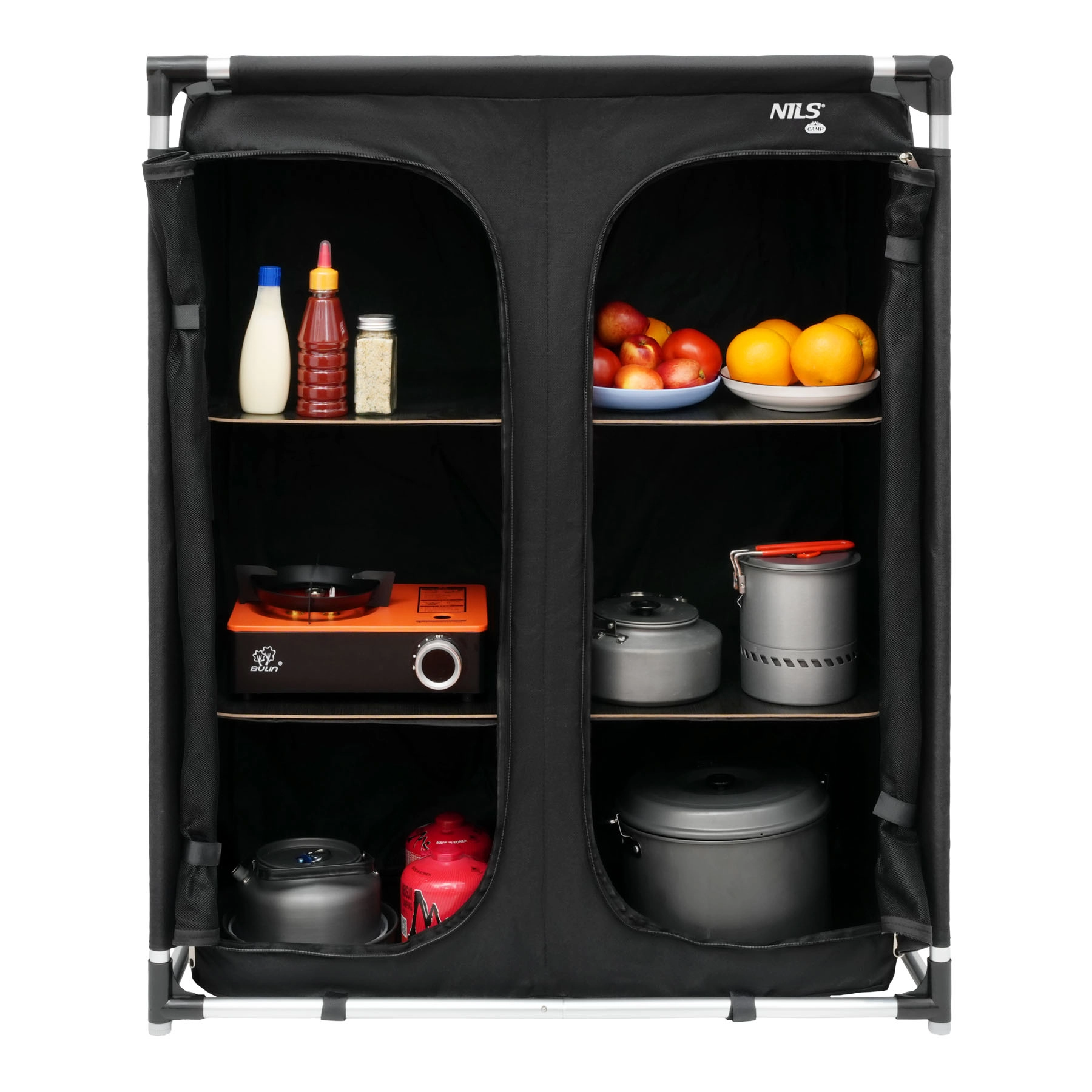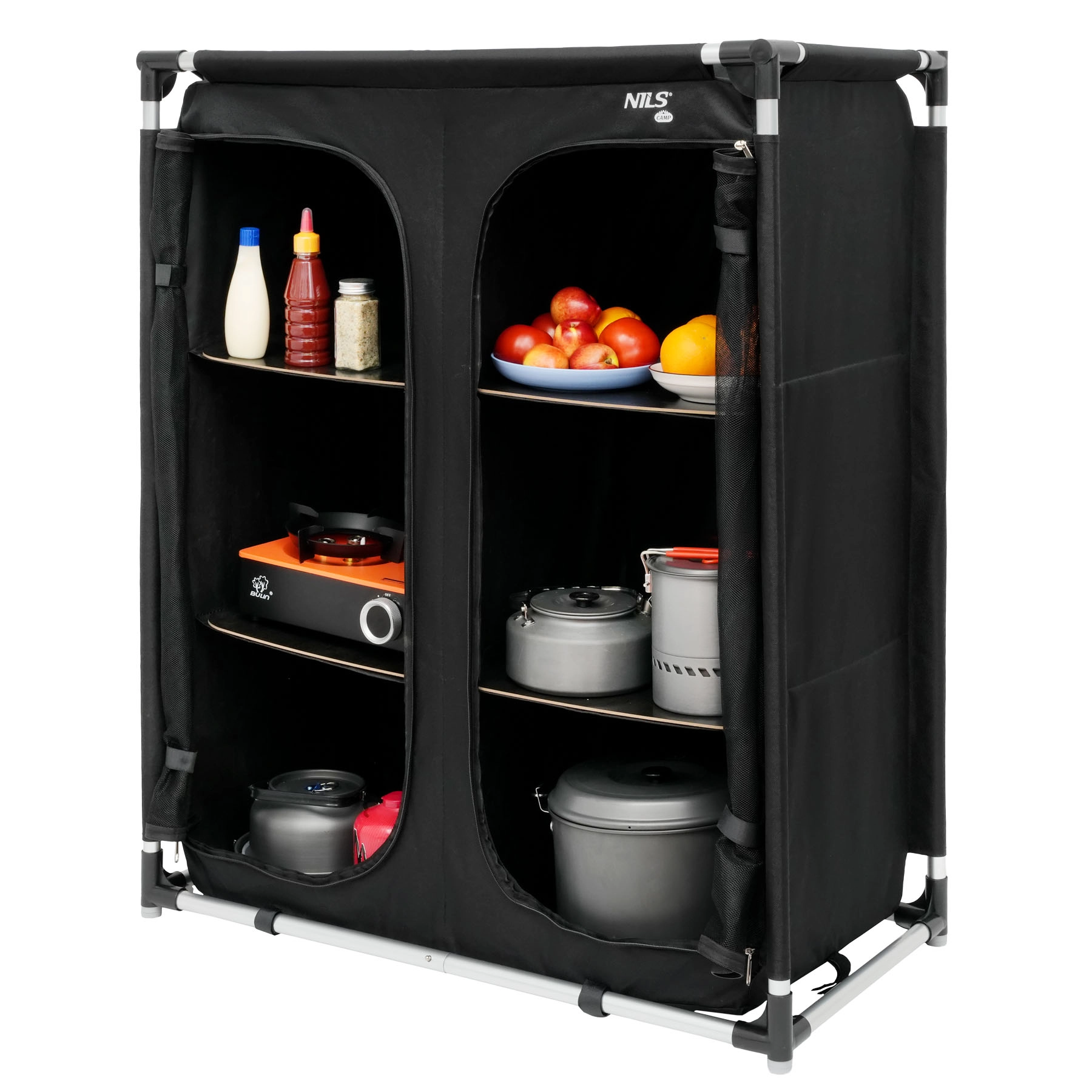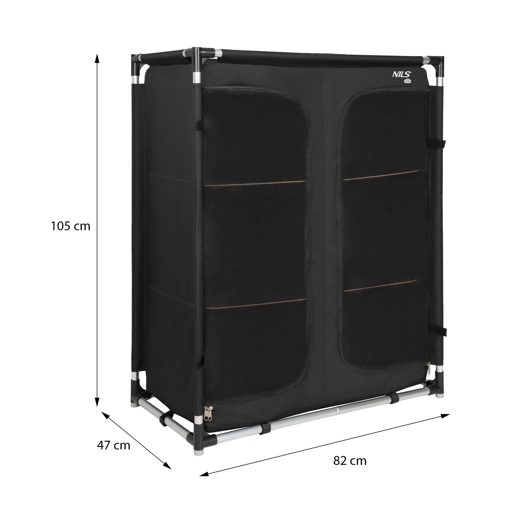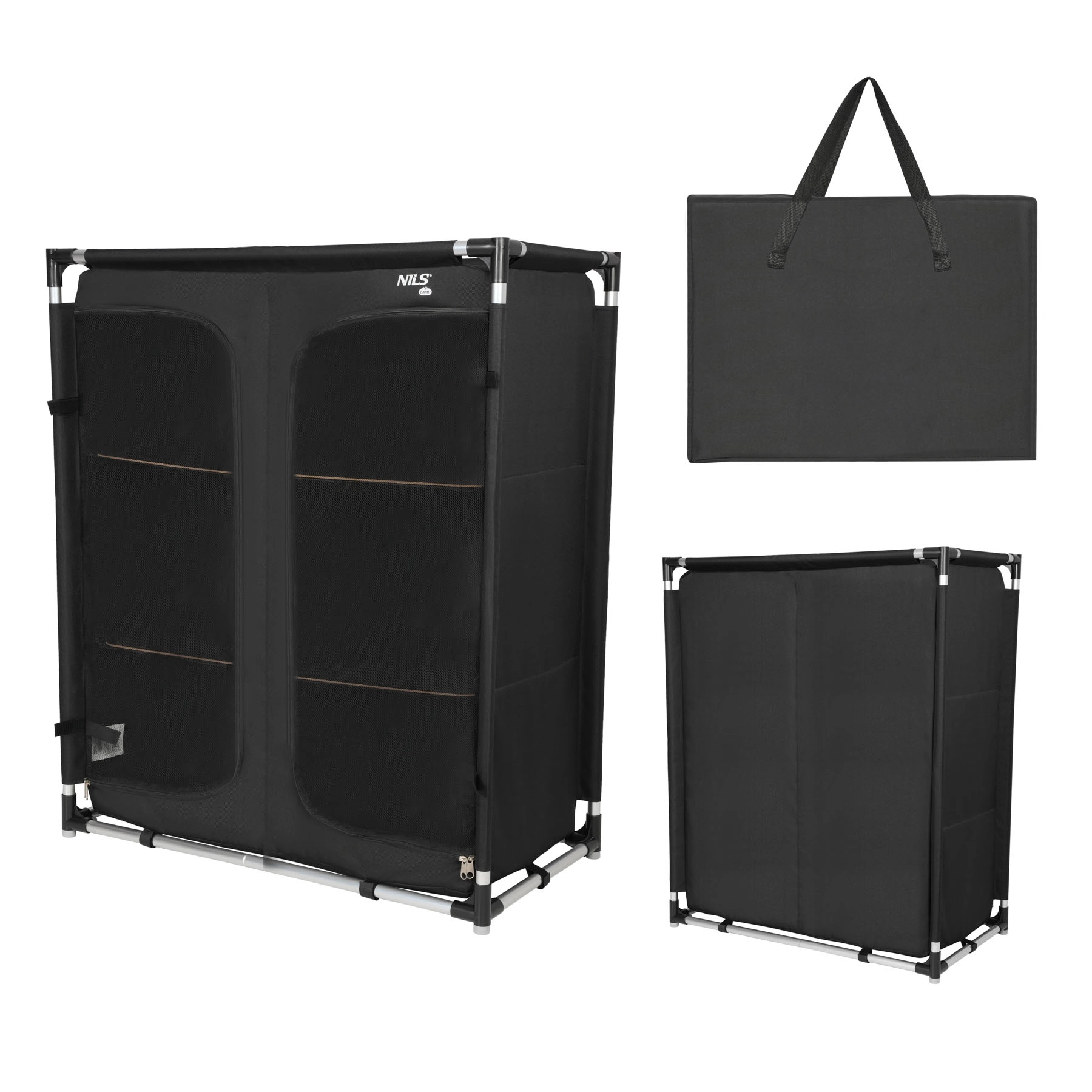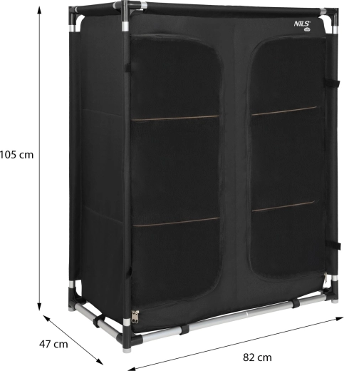 Det praktiske og lette camping skab NILS Camp XL giver orden, beskyttelse mod støv og insekter samt hurtig montering på få minutter. Takket være tre niveauer af hylder, åndbare frontpaneler med lynlås og en stærk men let aluminiumsramme får du komfort som derhjemme – i teltet, campingvognen eller sommerhuset. Når det er klappet sammen, passer det i en kompakt transporttaske, så du nemt kan tage det med overalt.
