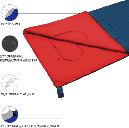 Tovejslynlås langs siden og nederst gør det muligt at folde den ud som et tæppe eller sammenlyne to soveposer til én for to personer.
