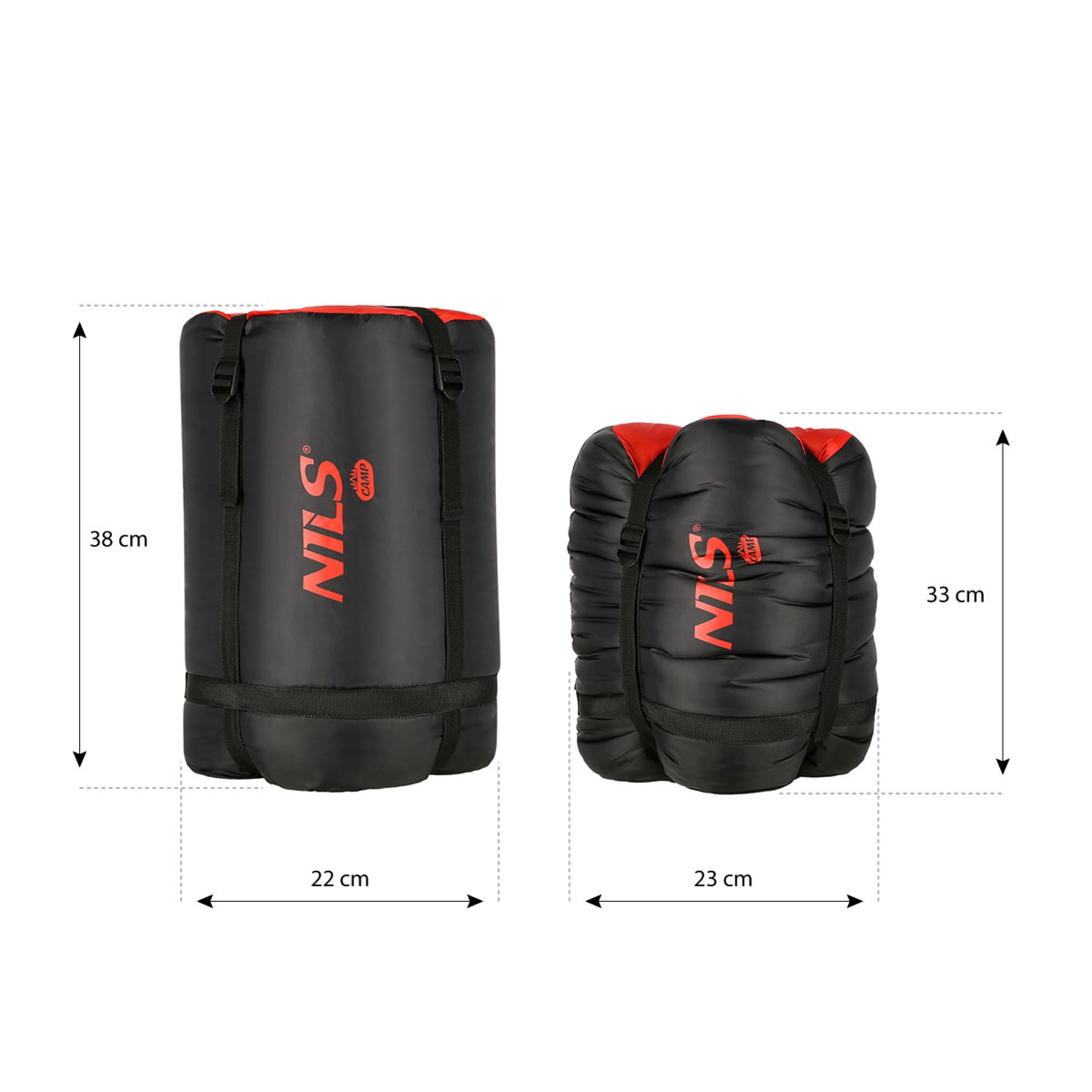 Omfatter en praktisk kompressionssæk med stropper, som reducerer volumen med cirka en tredjedel for nem transport.