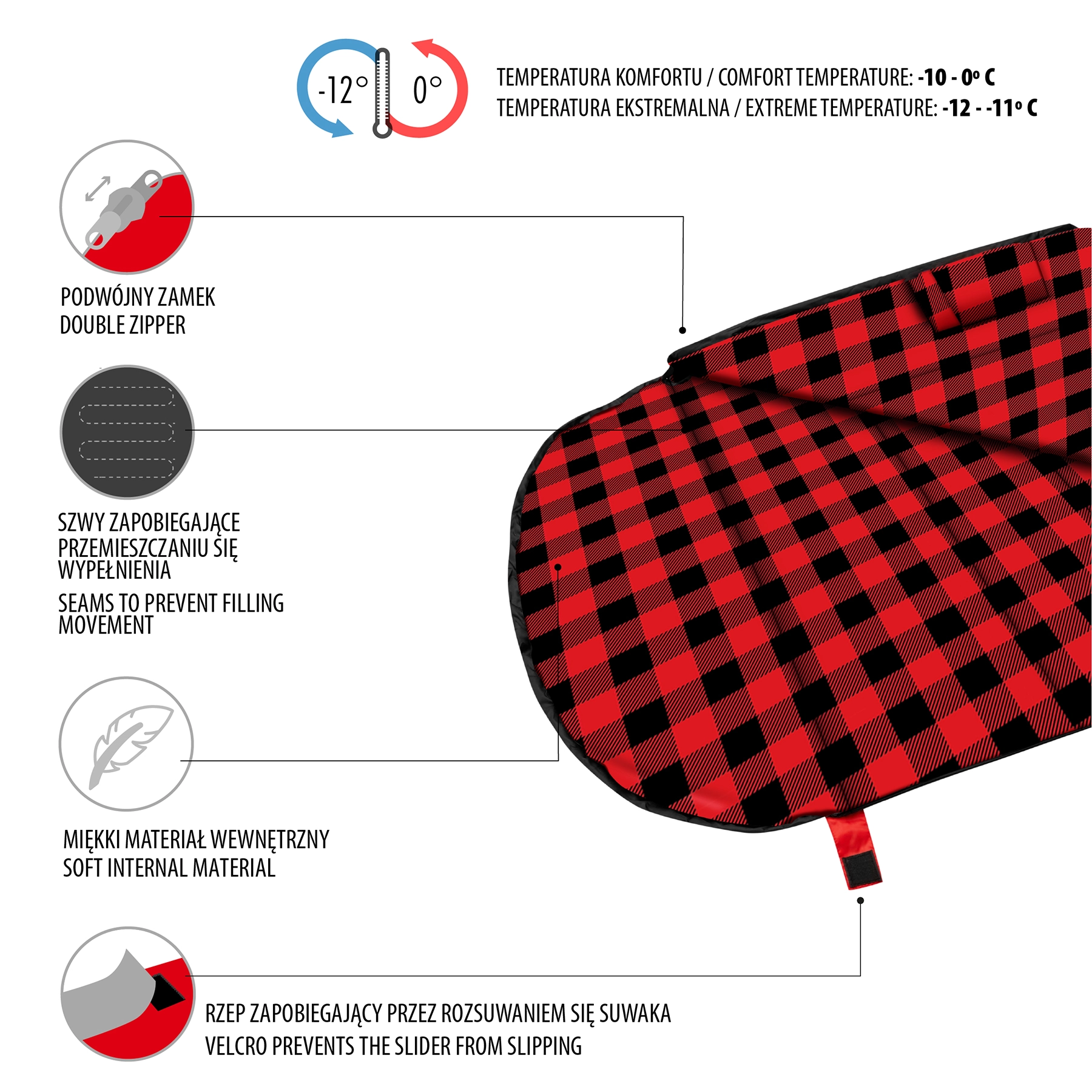 Den praktiske to-vejs lynlås er indvendigt dækket af en isolerende læg og sikret med en bred manchet med velcro, så den ikke åbner sig under søvnen. Den lange lynlås i siden og i bunden gør det muligt at åbne soveposen helt til et tæppe – en fremragende løsning til varmere nætter. Den integrerede hætte med træksnor hjælper med at holde på varmen omkring hovedet.