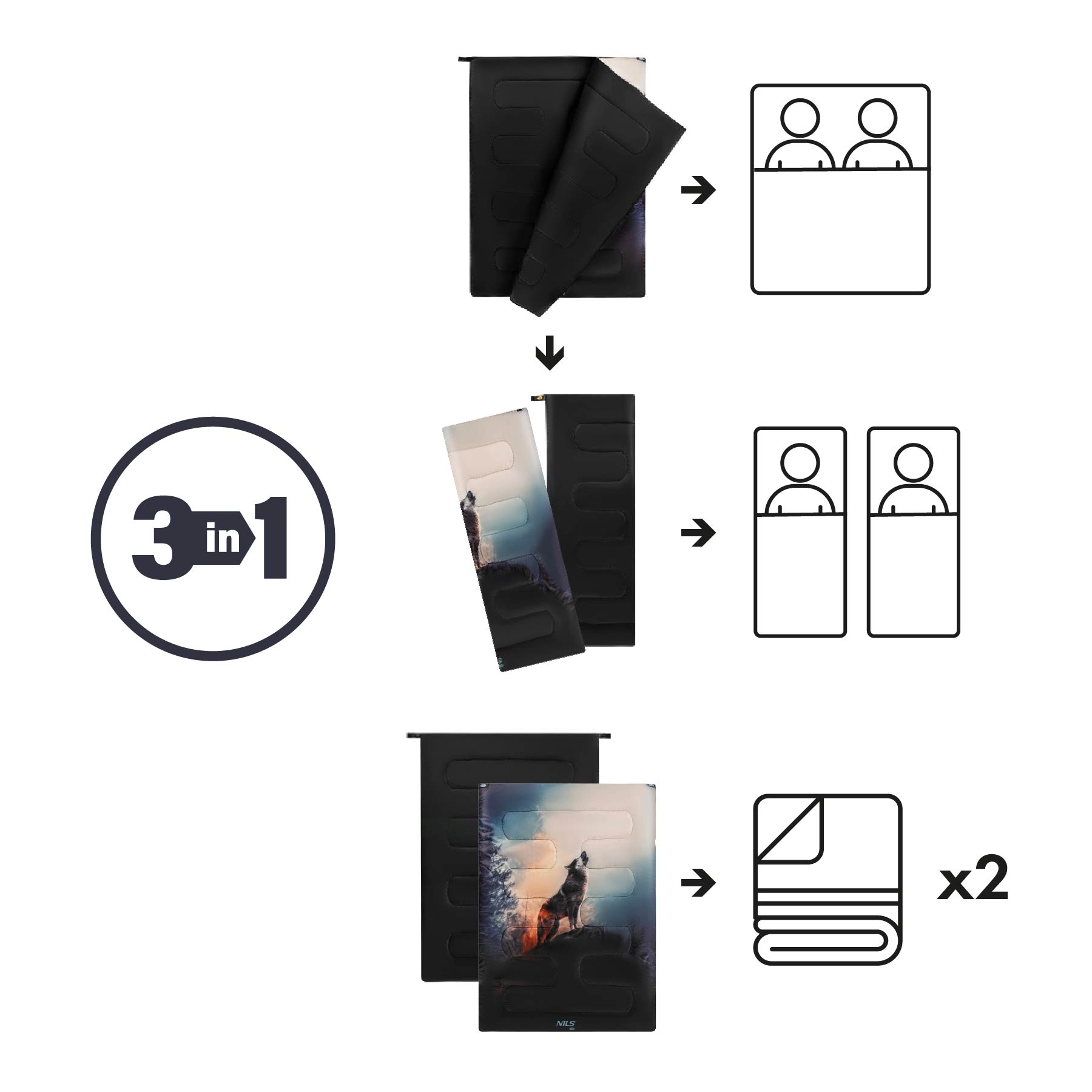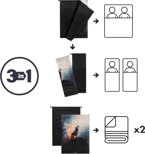 Leder du efter en rummelig og fleksibel sovepose til par eller solo-rejsende? NILS Camp Wolf 3-i-1 kombinerer alsidighed, varme og komfort. Ved at åbne lynlåsene laver du på få øjeblikke en dobbeltsovepose på 140 × 200 cm, to separate soveposer på 70 × 200 cm eller to selvstændige tæpper. Fyldet af hulfiber 300 g/m² holder effektivt på varmen, er let, elastisk og mindre følsomt over for fugt – ideelt til forårs-, sommer- og efterårsnætter.