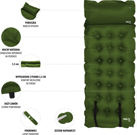 Dette selvoppustelige liggeunderlag er designet til komfortabel søvn under camping, på festivaler og ved afslapning ved vandet. Det indvendige åbencellede skum suger luft ind, når ventilen åbnes, og gendanner hurtigt formen, mens den integrerede pude nemt kan pustes op til den ønskede højde. Overfladen af holdbart polyester 190T med PVC er let at vedligeholde og klar til mere krævende forhold.