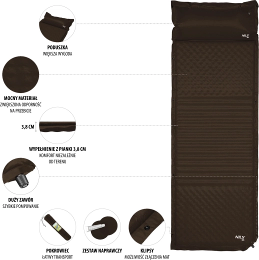 - Komfort og praktikalitet: selvoppusteligt system, integreret pude, nem pakning i pose.