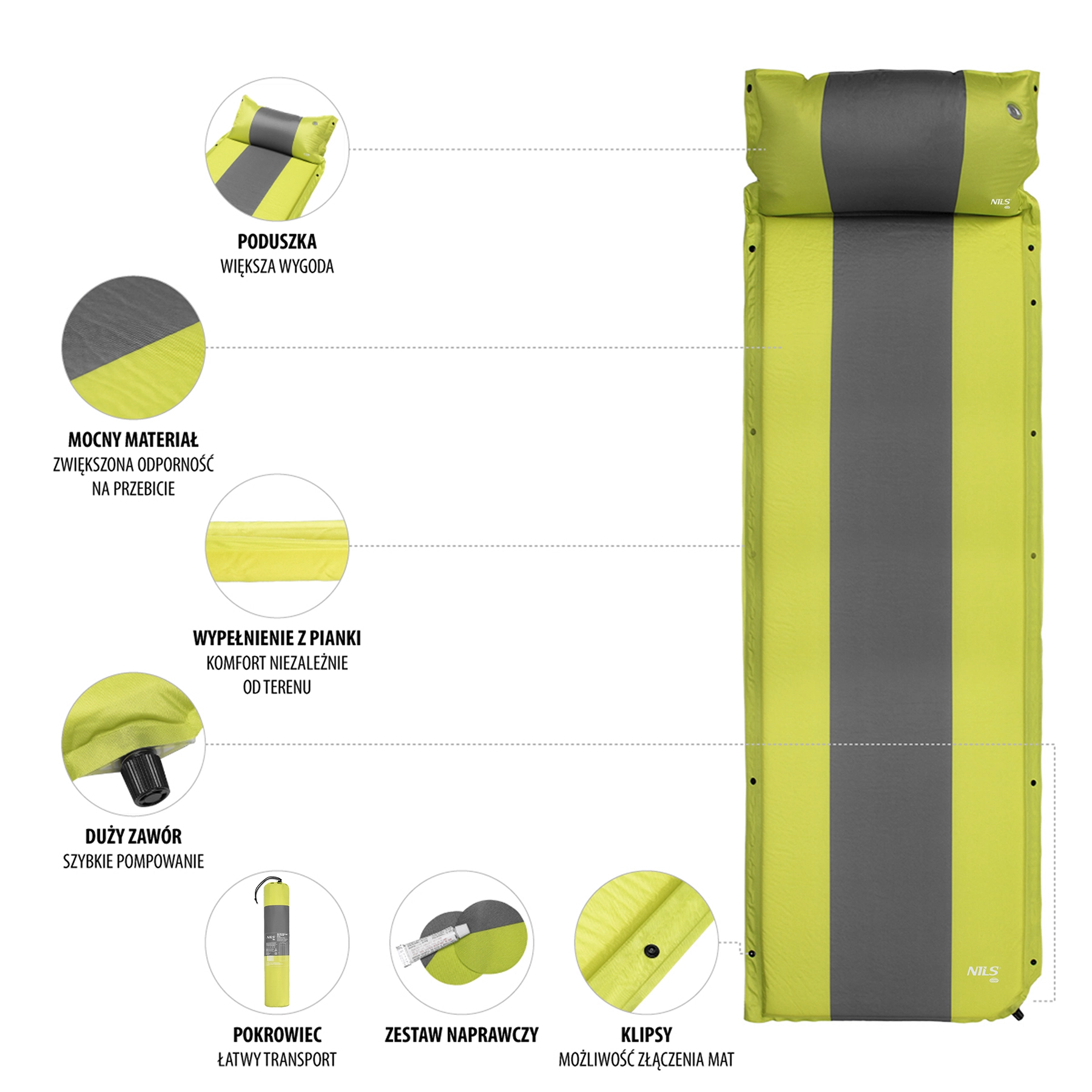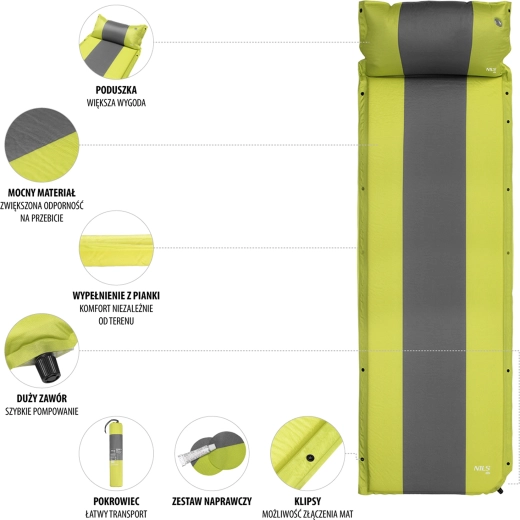 Den indvendige PU-skum med åbne porer fyldes selv med luft, når ventilen åbnes, og puden giver nakkestøtte uden behov for ekstra udstyr.