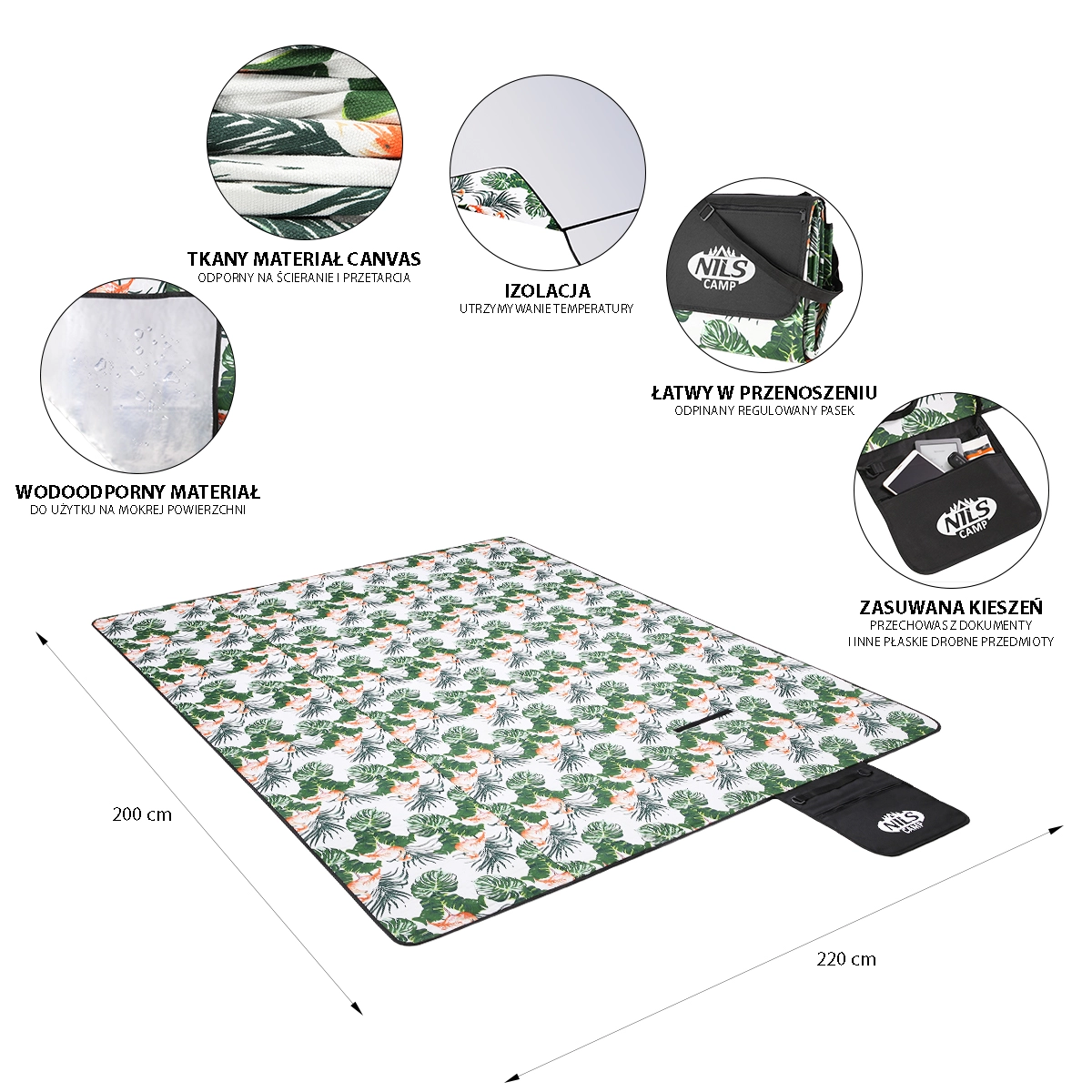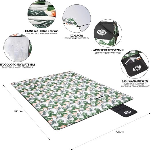 Det praktiske og stilfulde picnictæppe fra NILS CAMP er ideelt til familieture i parken, ved vandet og på camping. Det byder på en generøs flade på 200 × 220 cm, en behagelig floneloverflade og en underside med aluminiumsfolie og vandafvisende finish, der beskytter mod fugt og kulde. Det er let at folde sammen til en kompakt “taske” med hank og justerbar skulderrem, og du vil også sætte pris på den praktiske lynlåslomme til småting.