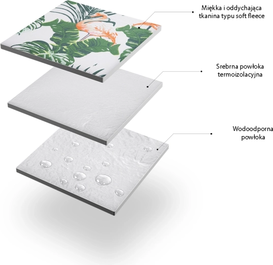 Dette alsidige picnictæppe er designet til komfortabelt at sidde og ligge på enhver overflade. Oversiden er lavet af blød og slidstærk flonel, mens undersiden af aluminiumsfolie med vandafvisende finish effektivt isolerer mod vådt græs og kold jord. Med målene 200 × 220 cm giver det rigelig plads til hele familien.