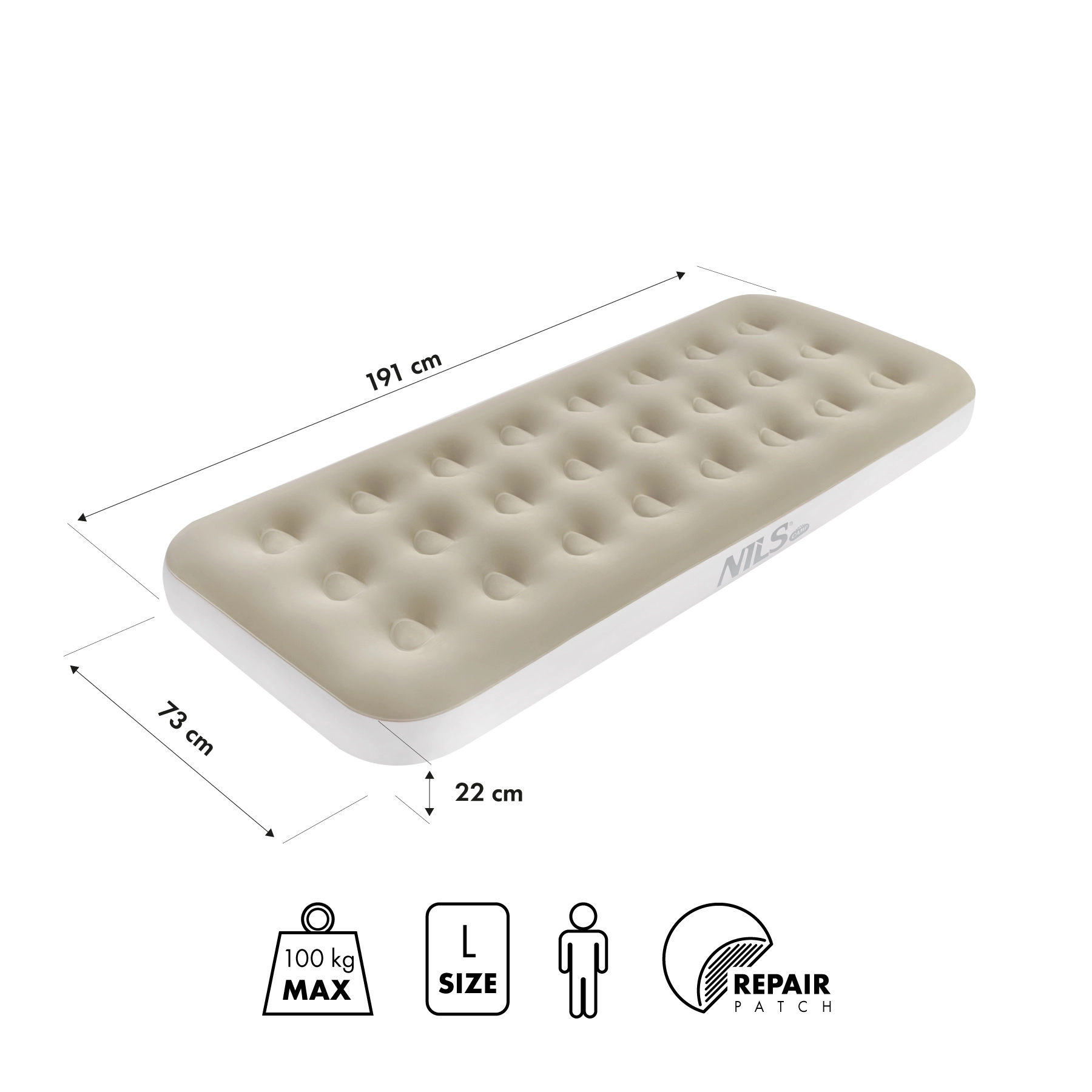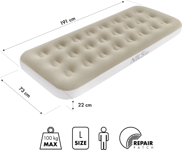 Den oppustelige madras NILS Camp er et pålideligt valg til gæster, have og teltture. Det robuste PVC med en behagelig overflade og en gennemtænkt indvendig struktur fordeler kropsvægten jævnt for rolig og komfortabel søvn. Højden på 22 cm sikrer desuden bedre varmeisolering og nemmere oprejsning.