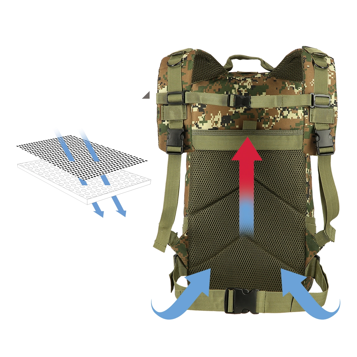 - Justerbare, polstrede remme + bryst- og hoftebælte