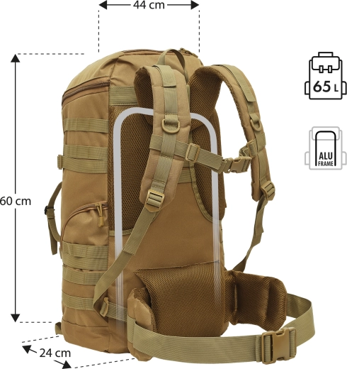 Den robuste, turistiske rygsæk NILS Camp Maverick med et volumen på 65 l er designet til lange trekketure, camping og survival. Den tilbyder en holdbar konstruktion, hurtig adgang takket være fuld åbning, aluminiumsramme for stabilitet og lav vægt på 1,4 kg for behagelig bæring.