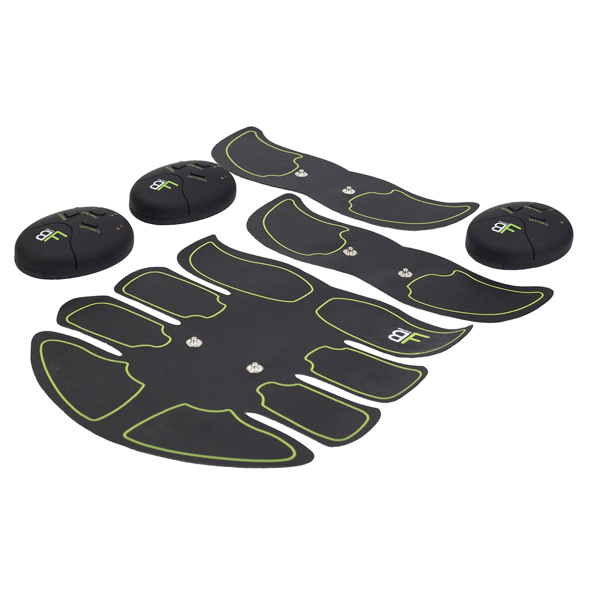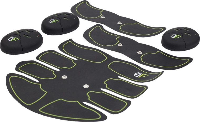 Den primære mavemåtte og to mindre enheder til arme eller lår dækker nøgleområder for effektiv styrkelse og formning.