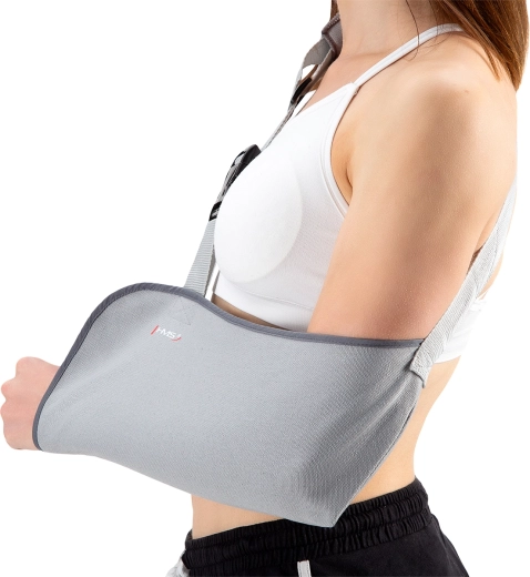 Tekstilposen i slyngen støtter underarmen sikkert og fikserer armen i en komfortabel position, hvilket reducerer smerte og forhindrer uønskede bevægelser under heling.