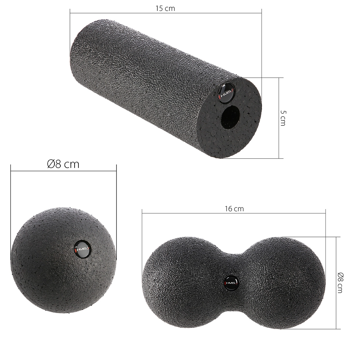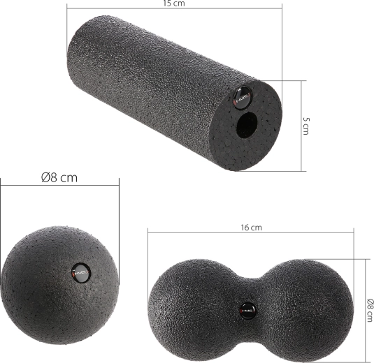 Lindr overbelastede muskler og fremskynd restitutionen med det alsidige HMS-sæt til selvmassage. Den lille bold (Ø 8 cm) masserer præcist triggerpunkter, dobbeltbolden (peanut) frigør effektivt dybe muskelgrupper langs rygsøjlen, nakken eller balderne, og minirullen er ideel til underarme og fodsåler. Sættet er velegnet til hjemmet, fitnesscenteret og på rejser.