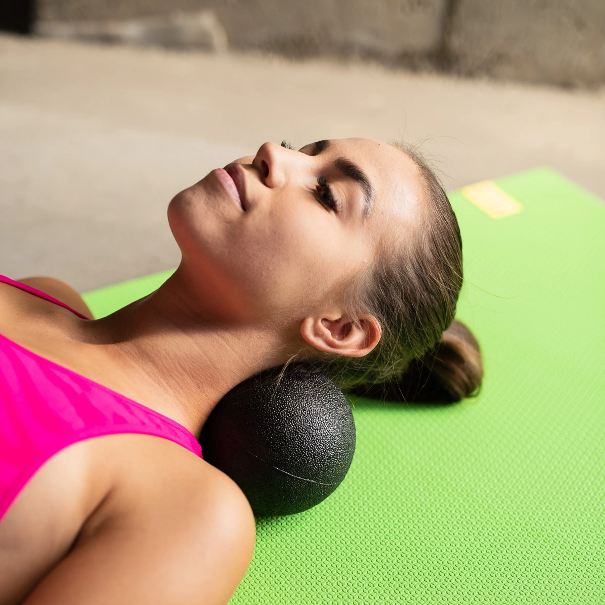 Placér bolden under baghovedet og løs muskelknuder med blide bevægelser. Ideel til lange perioder med stillesiddende arbejde og efter træning.